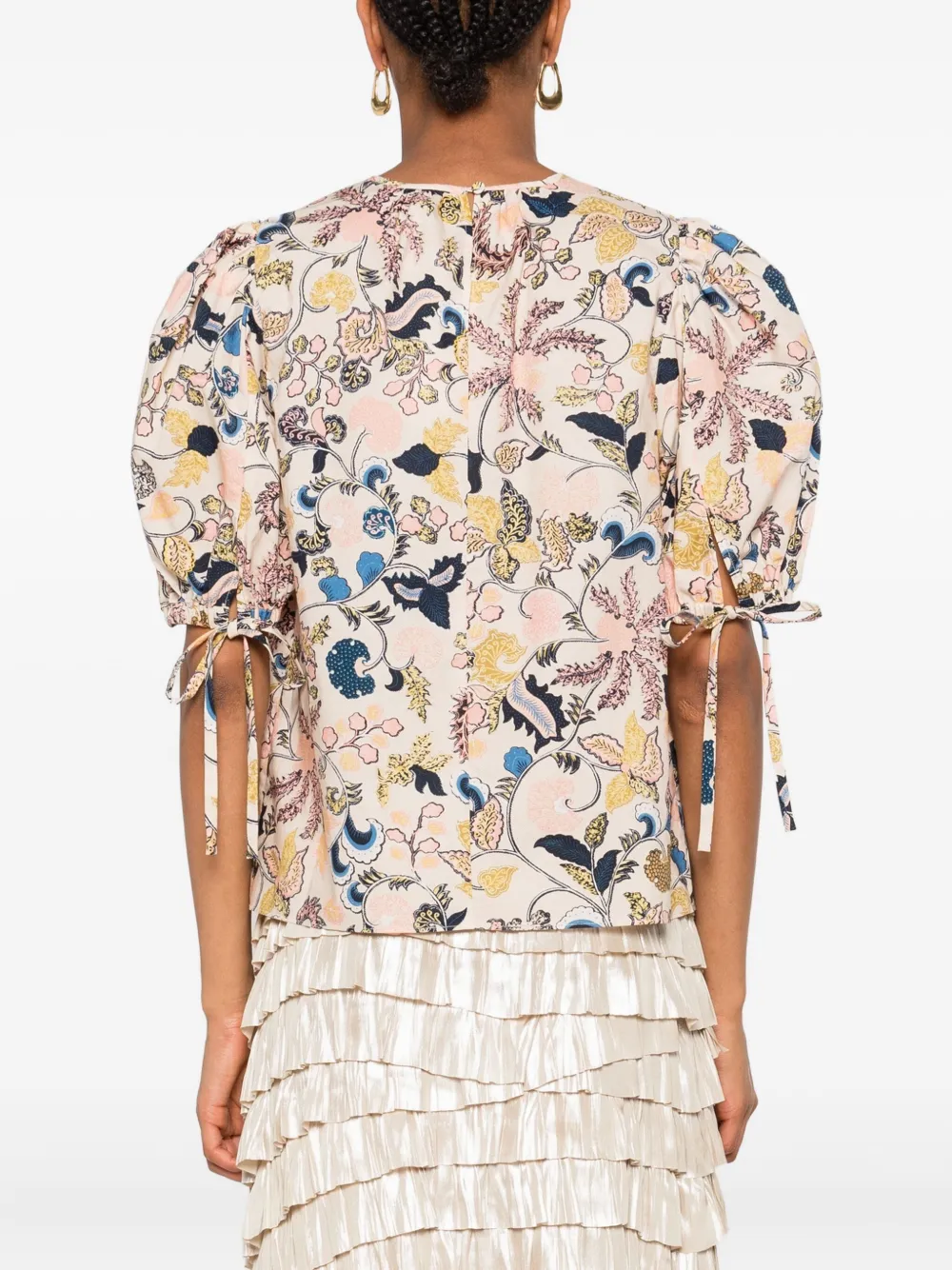 Бежевый цветочный принт, завязывающиеся манжеты, круглый вырез, рукава-буфы.