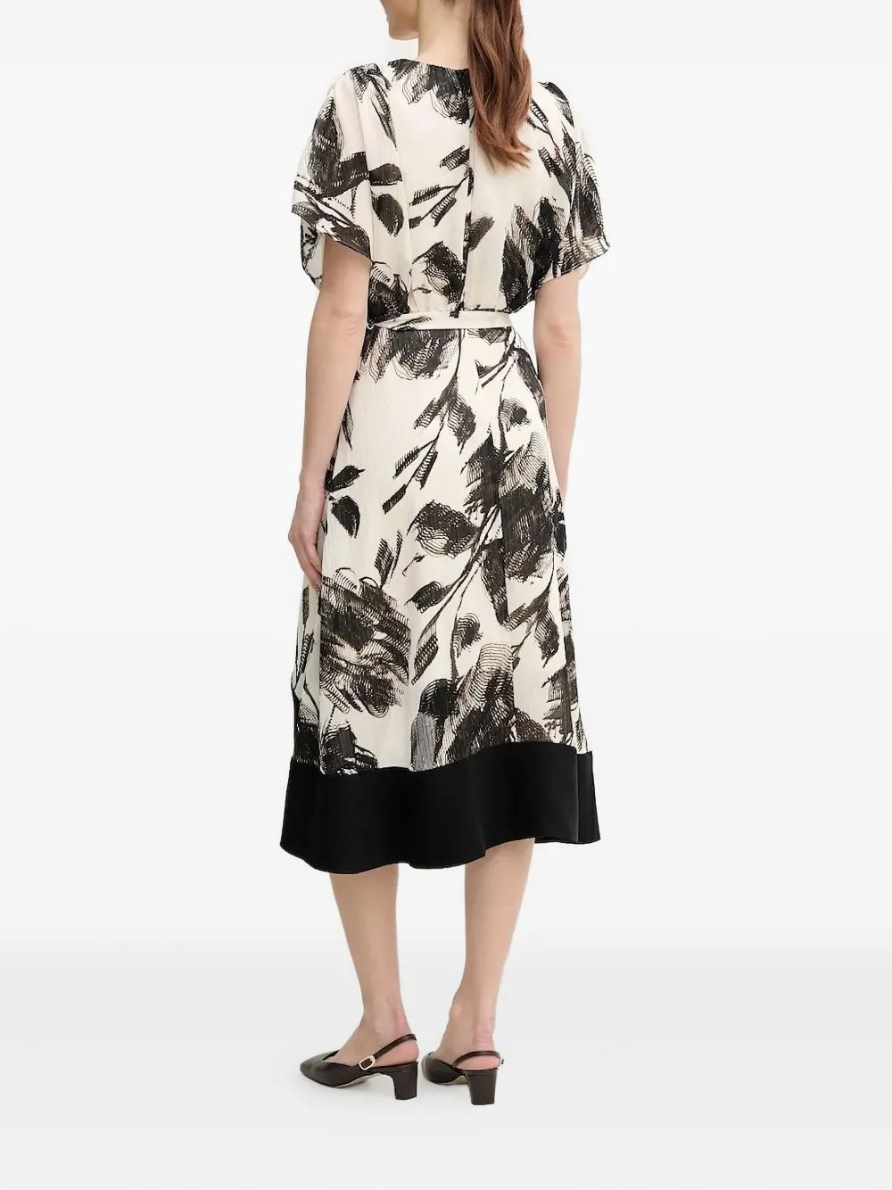 Бело-черный цветочный принт, лиф-халат, завязывающийся пояс, короткие рукава, асимметричный подол.