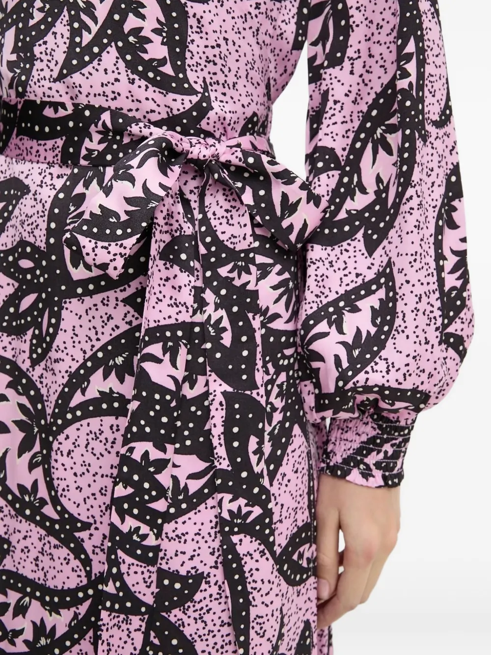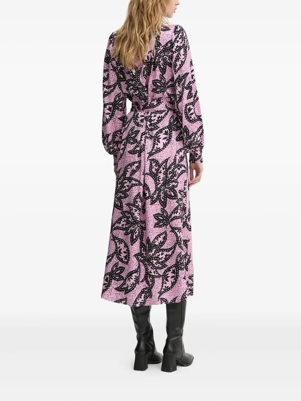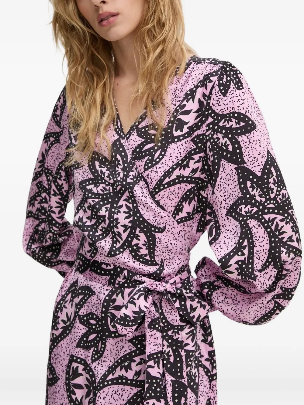 Розовый цветочный принт, застежка-накидка, длинные рукава, V-образный вырез, завязывающийся пояс.