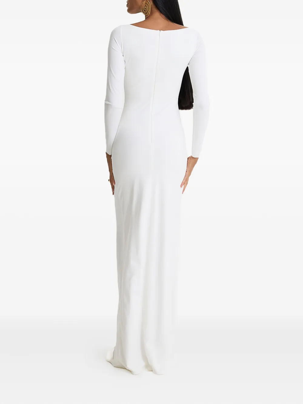 Белое платье с длинными рукавами, вырезом-лодочкой, узлом спереди, разрезами по бокам, макси-длина