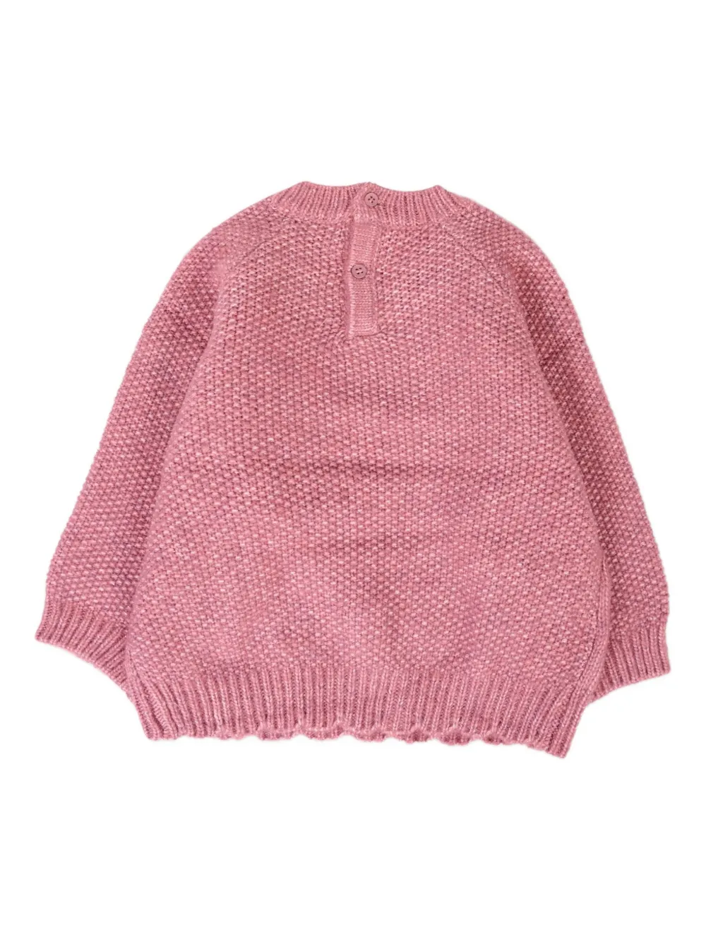 Розовый фактурный трикотаж с вышитыми цветами, круглым вырезом, длинными рукавами и ребристым подолом.