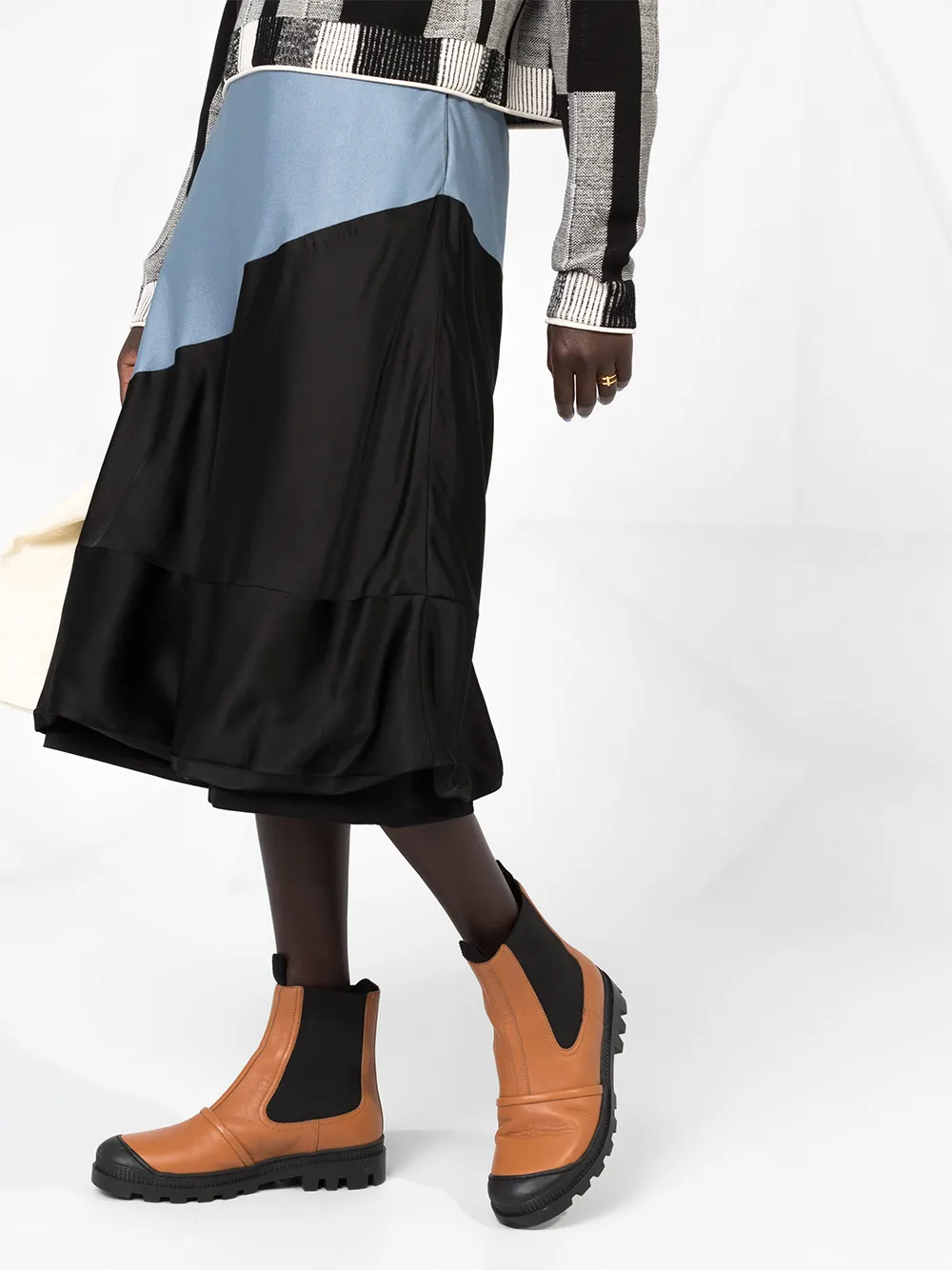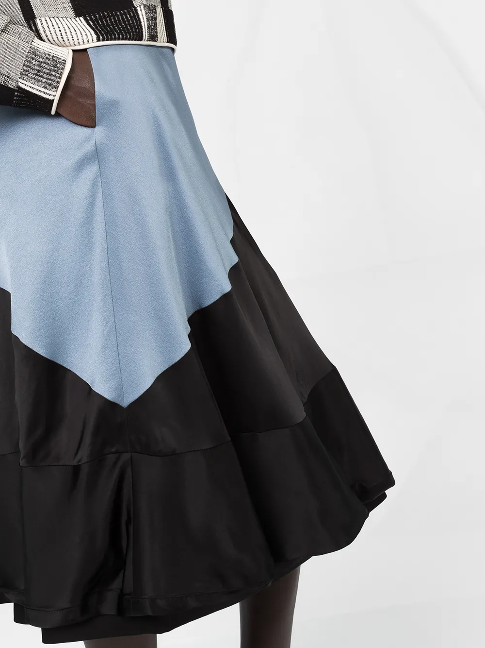 Пышная юбка в стиле колор-блок от Loewe. Пояс, А-образный силуэт, боковые карманы и подол с рюшами. Цвет: голубой, темно-серый, черный.