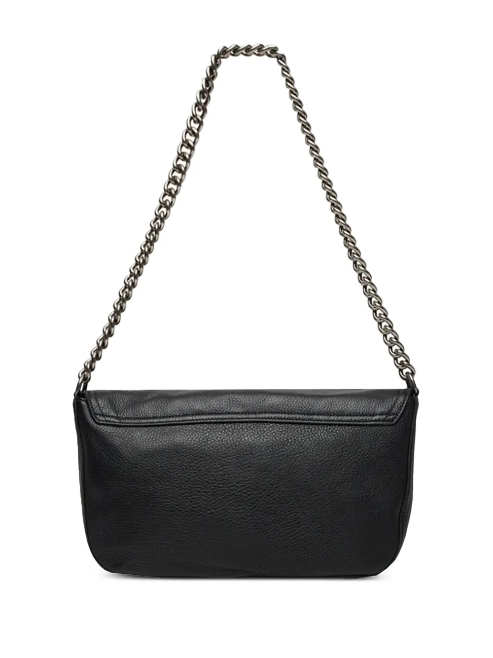 Черная кожаная застежка-клапан с цепочкой, логотипом и серебристой фурнитурой.