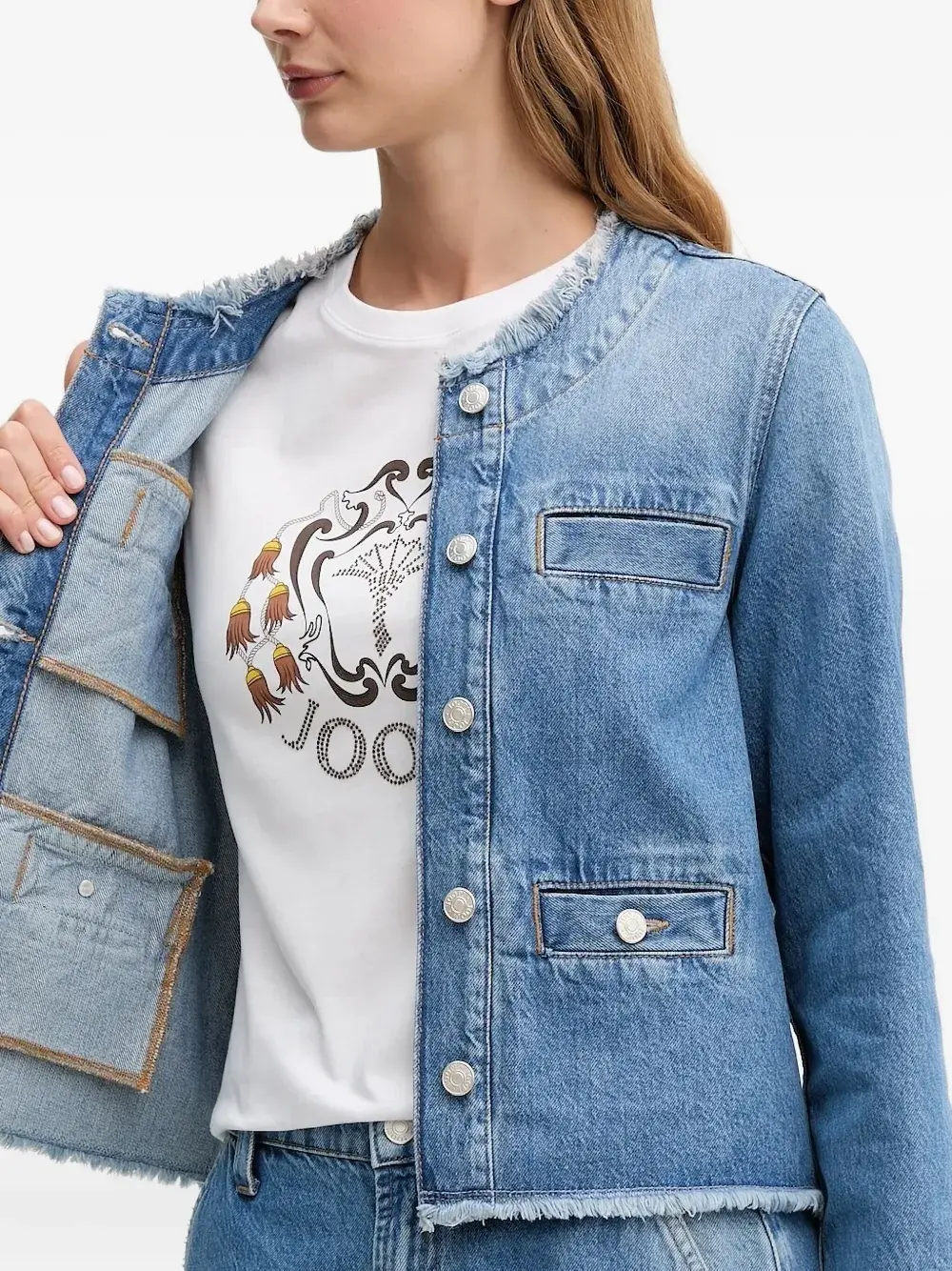 Синие необработанные края, застежка на пуговицы, прорезные карманы, круглый вырез, длинные рукава.