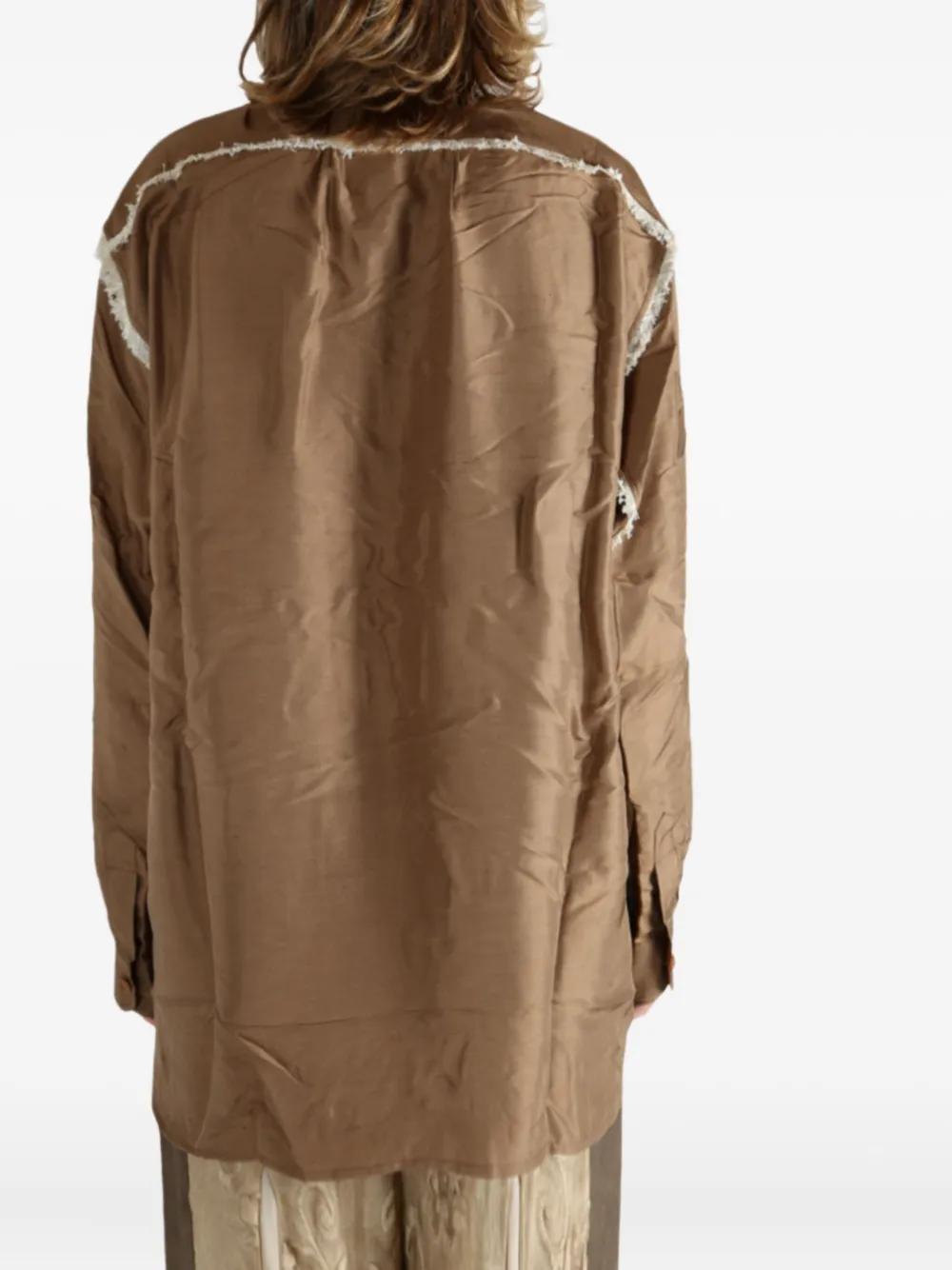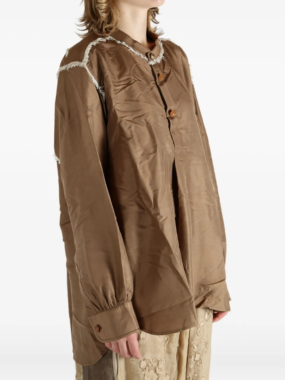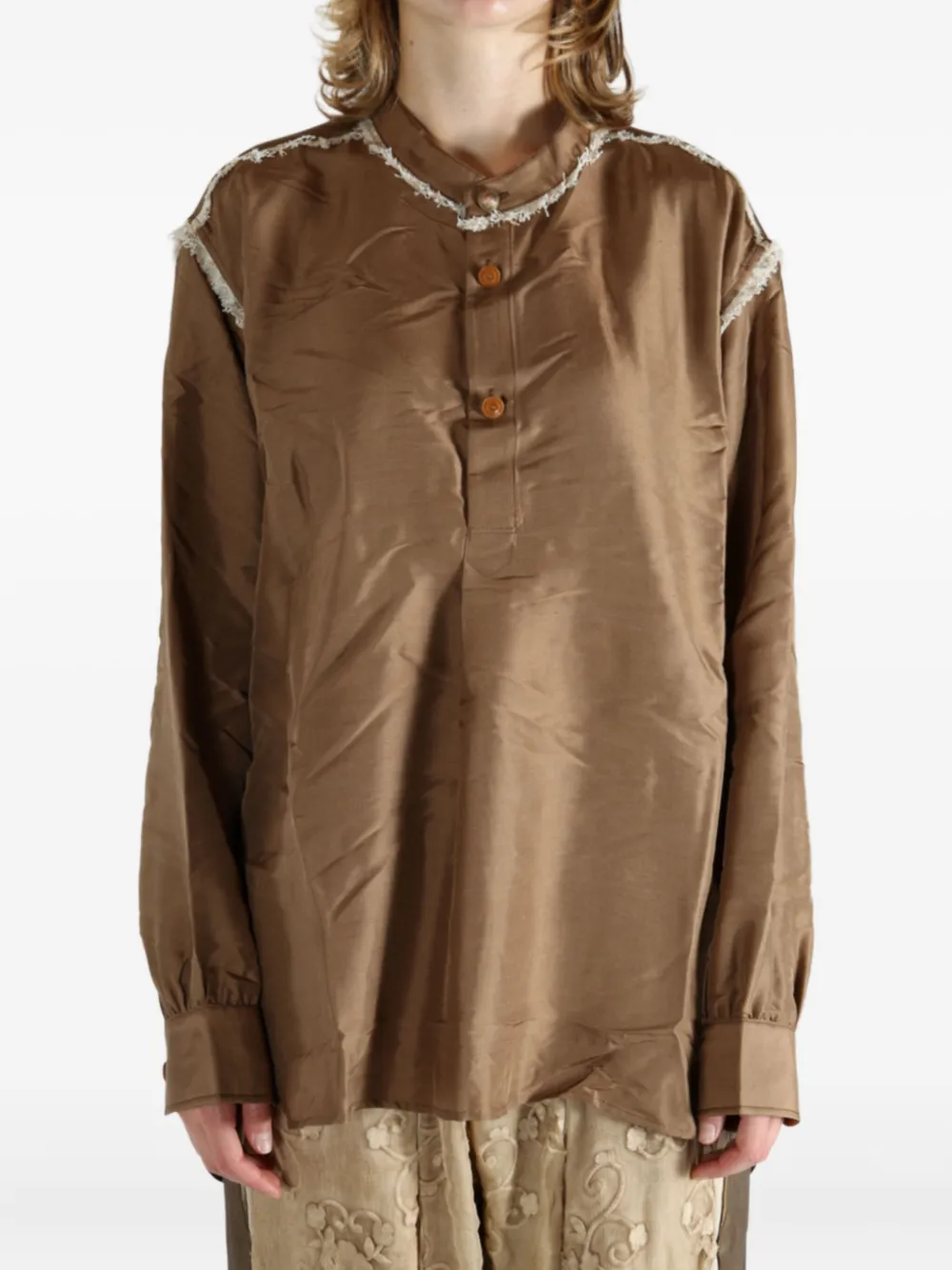 Длинные рукава, застежка на пуговицы, карамельные необработанные края.