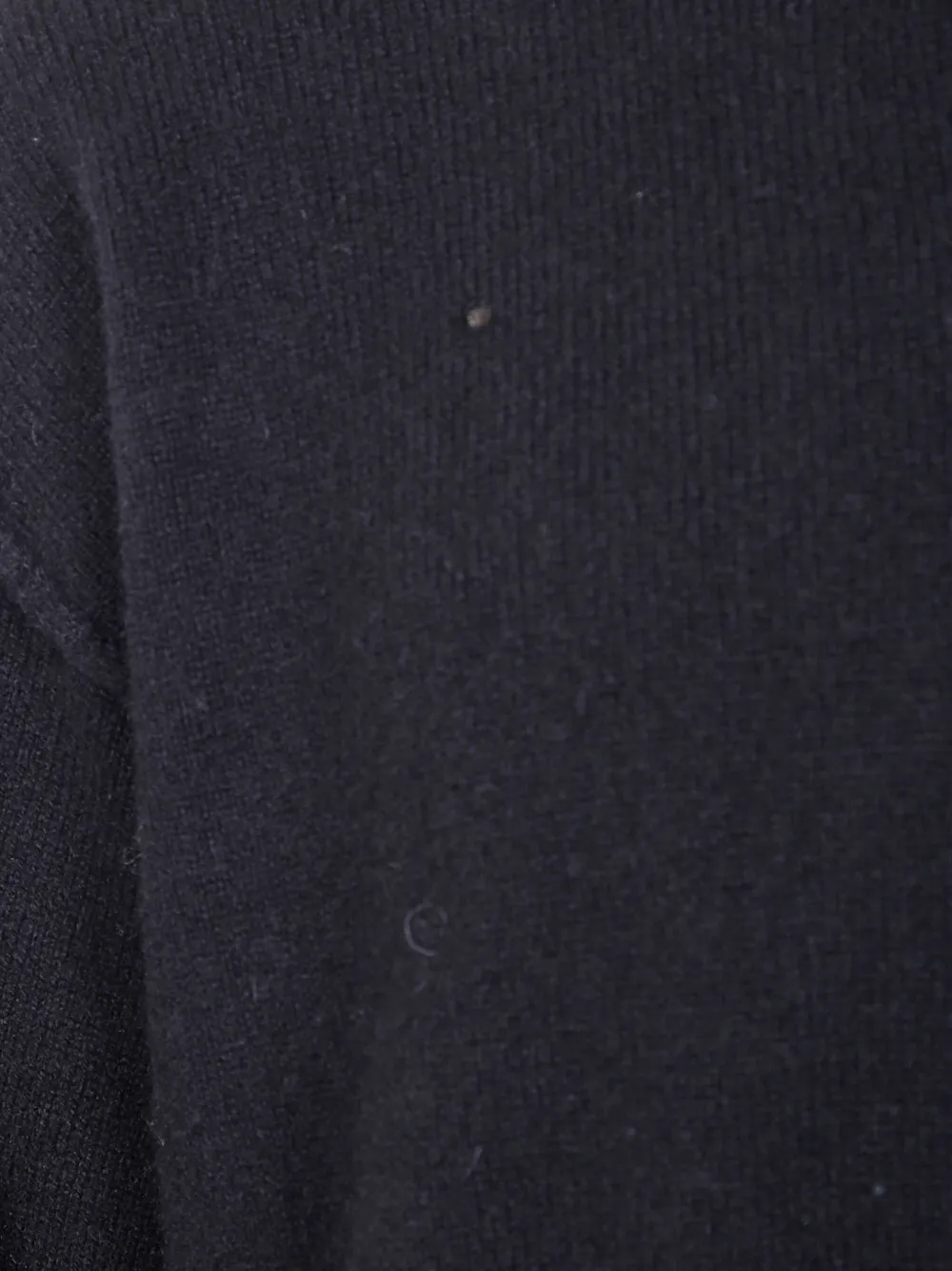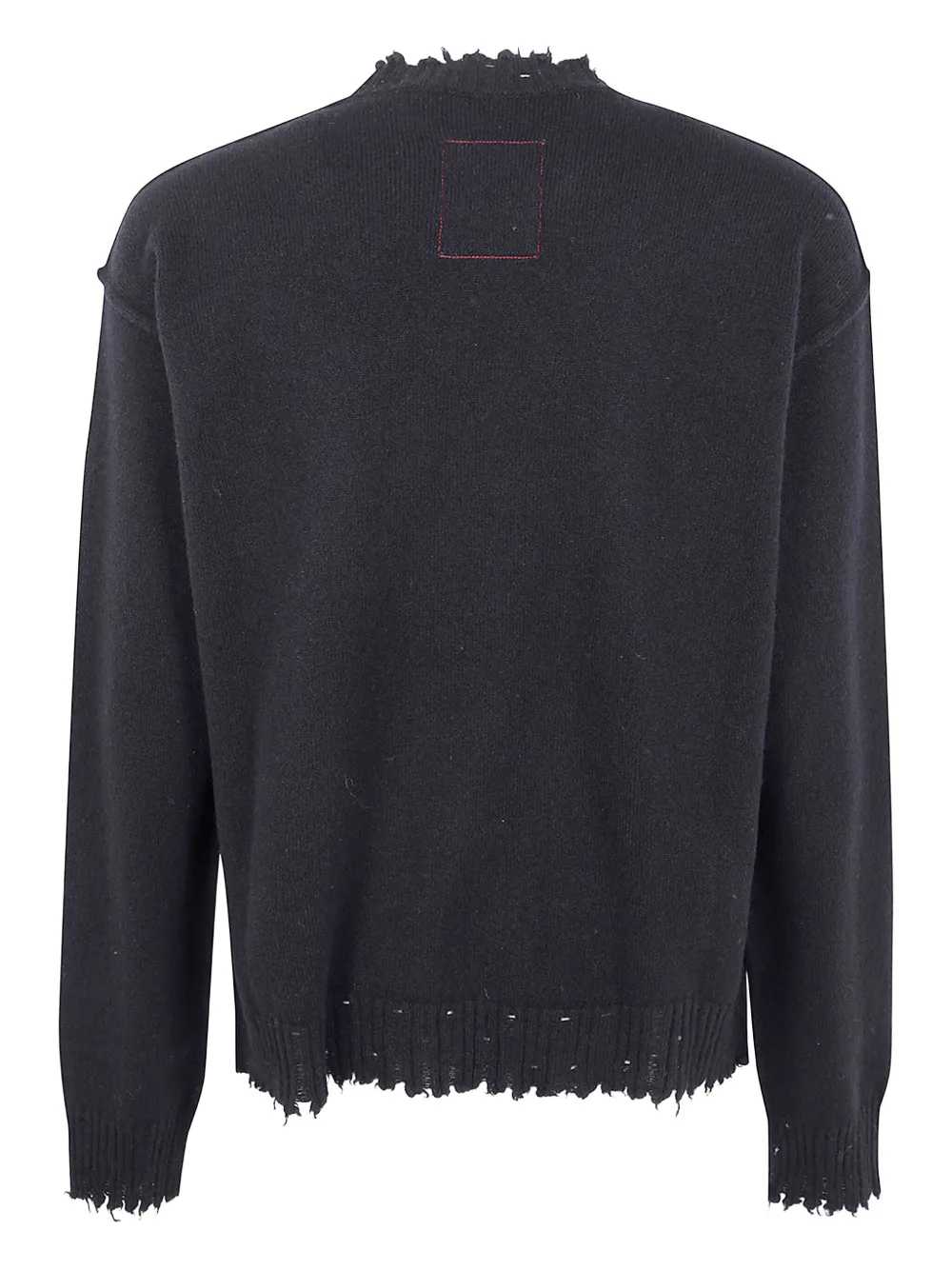 Выстиранная черная кашемировая шерсть, необработанный край, круглый вырез, необработанные края, маленький красный квадрат сзади.