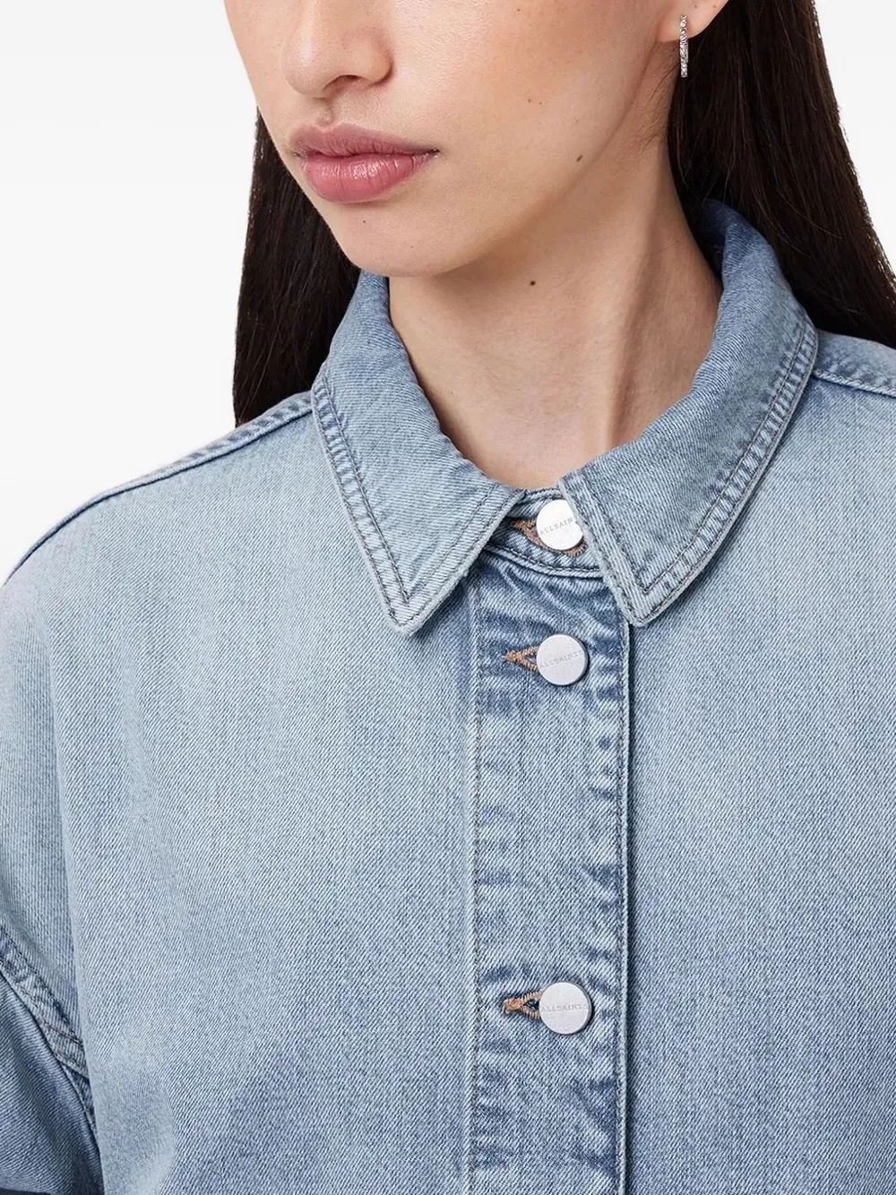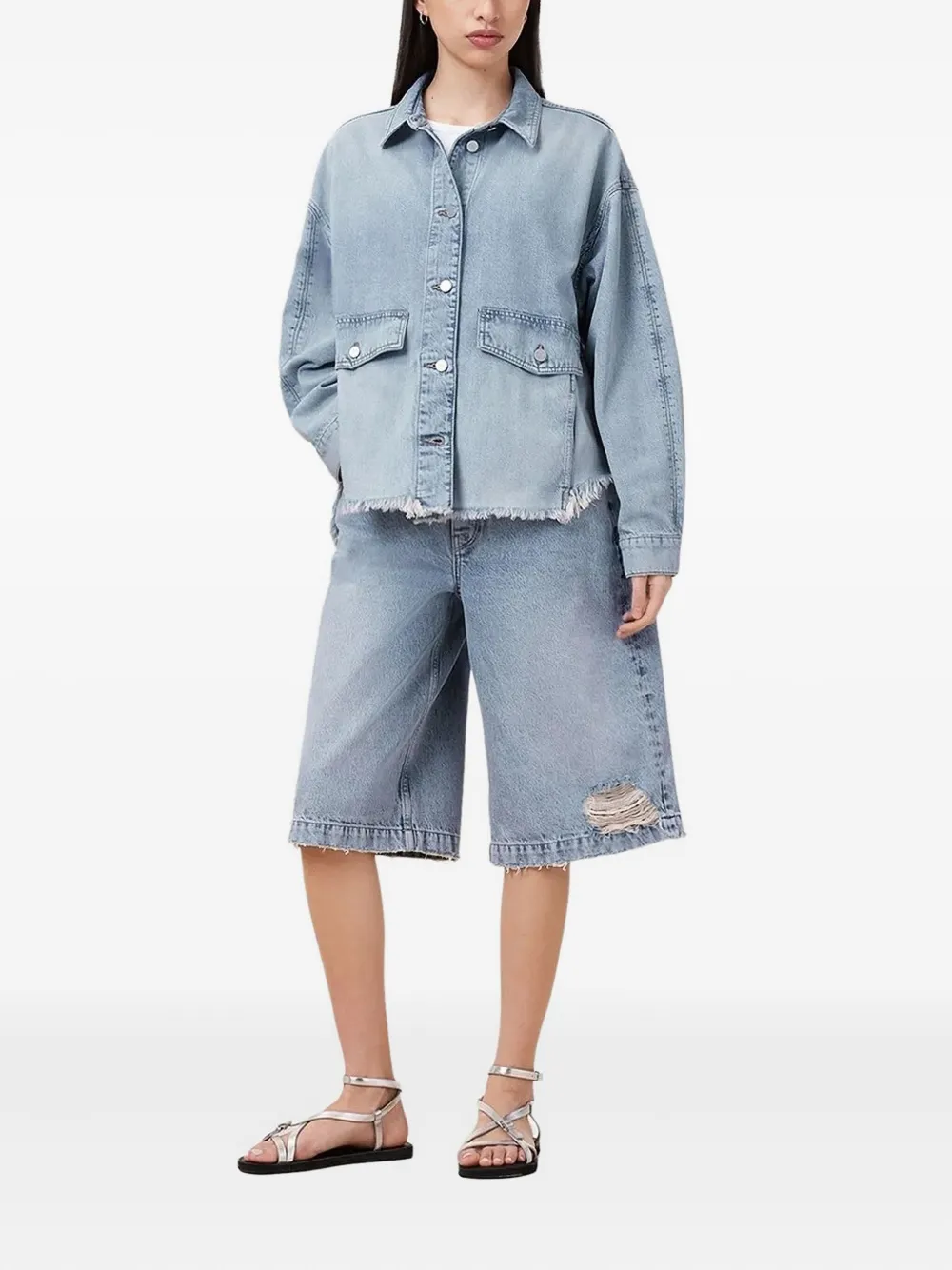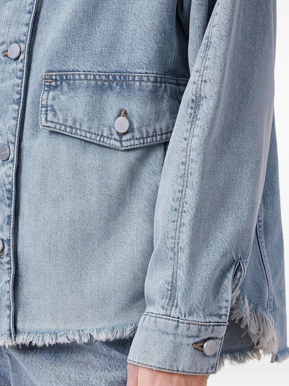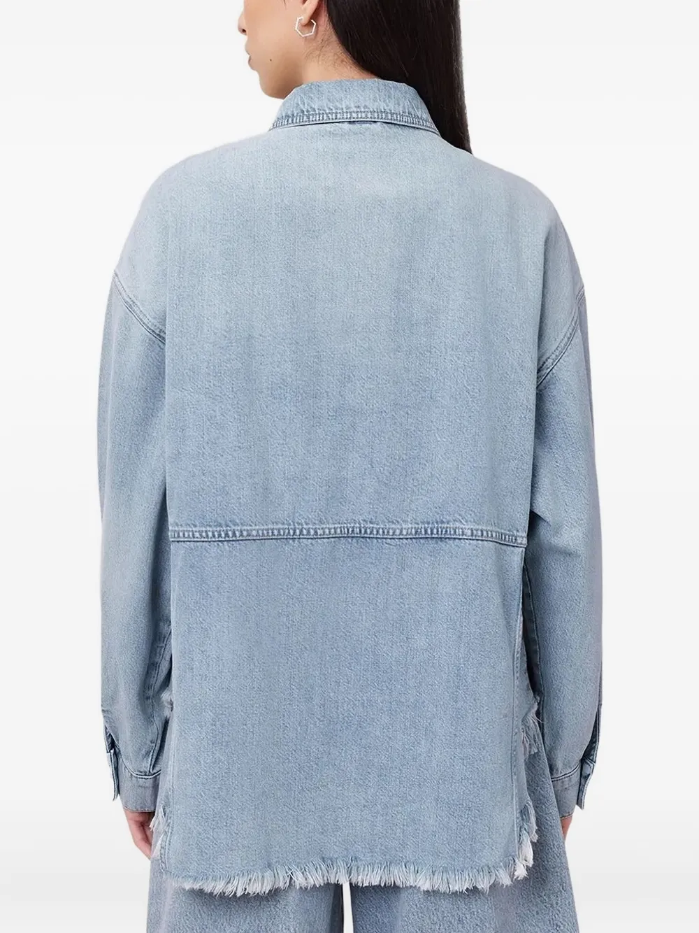 Светло-индигово-голубой, необработанный подол, застежка на пуговицы, карманы с клапанами, длинные рукава