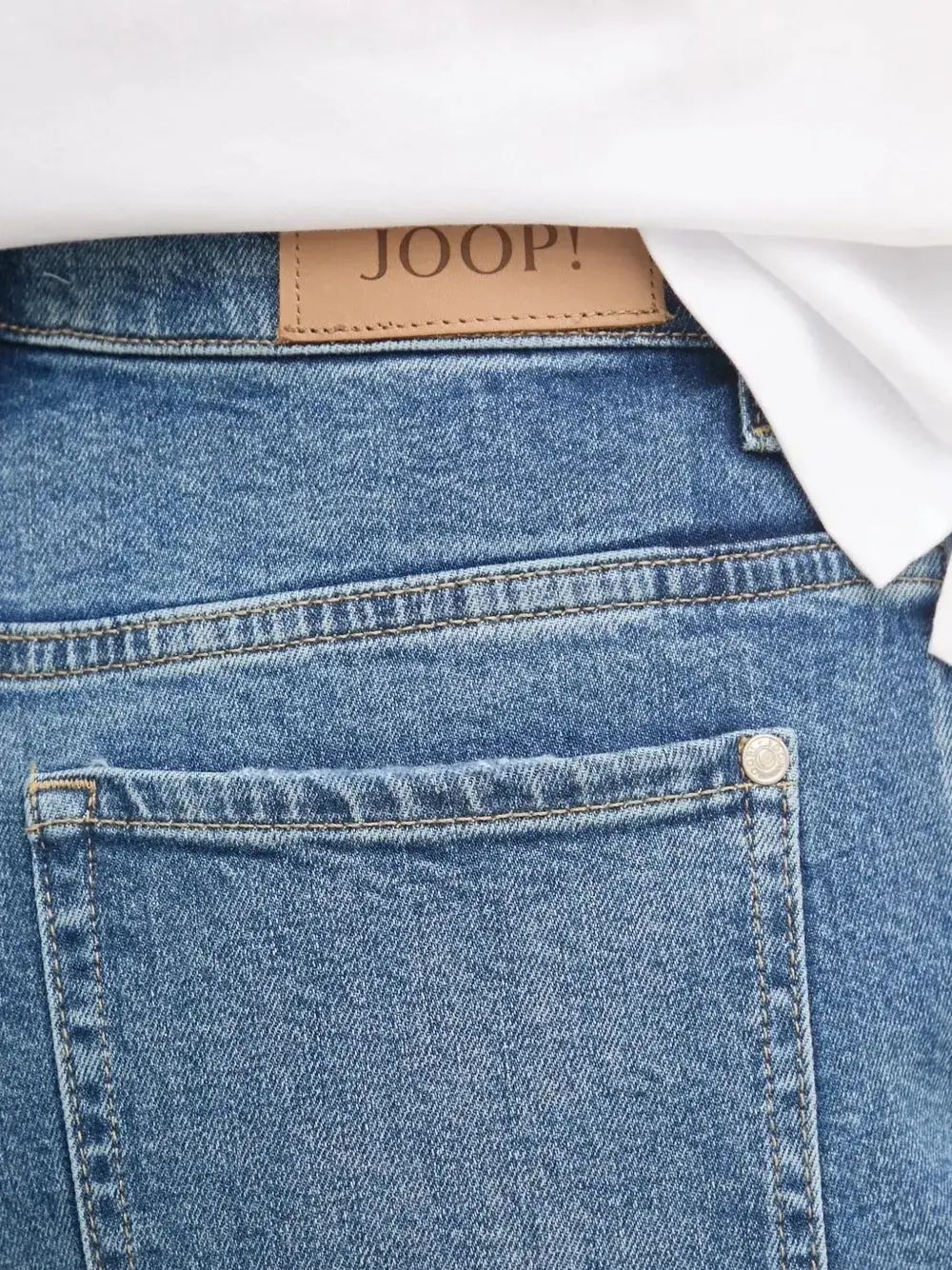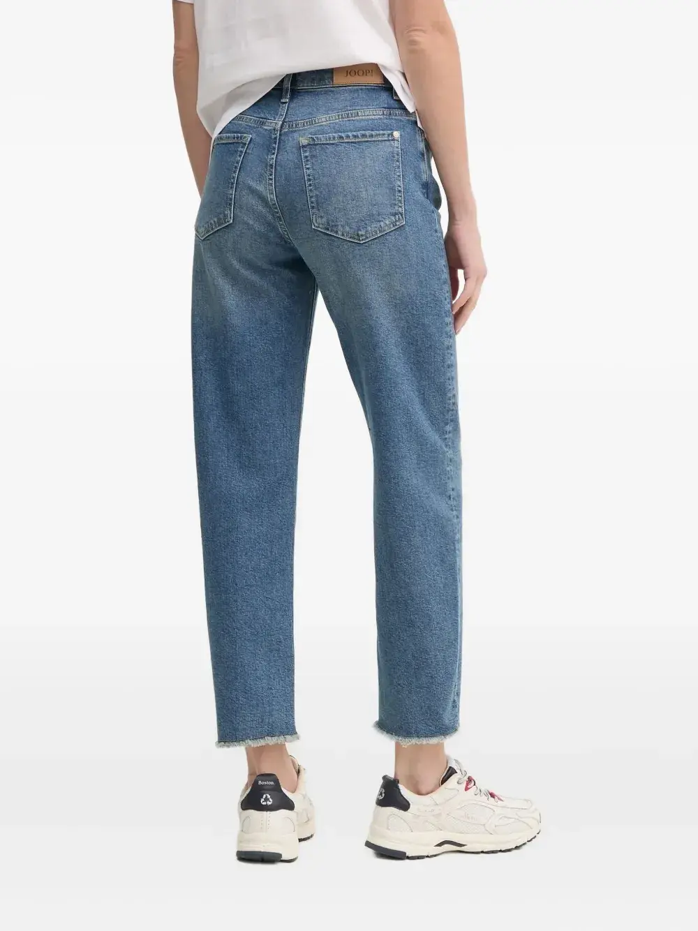 Синяя кожаная нашивка с логотипом и бахромой на подоле, пять карманов