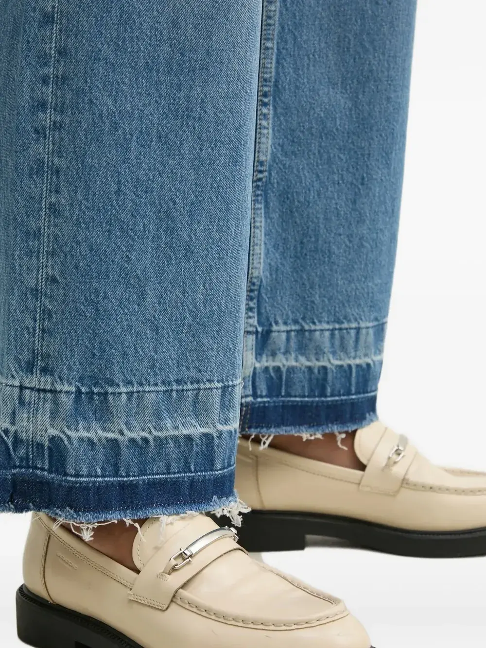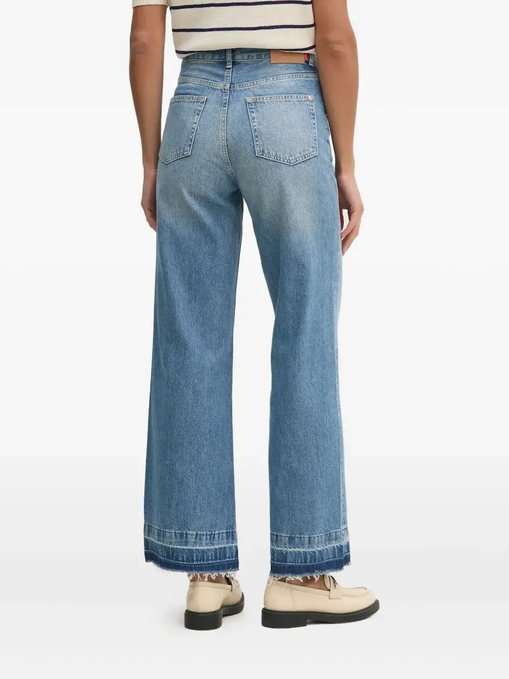 Светло-голубой, с необработанным краем, классические пять карманов, застежка на пуговицы.