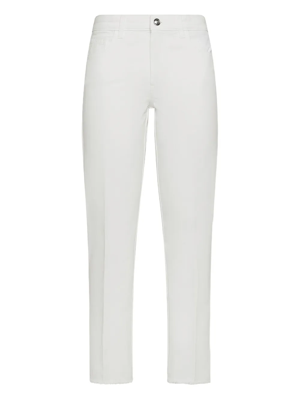 Белый бахромчатый край, застежка на пуговицы, пять карманов
