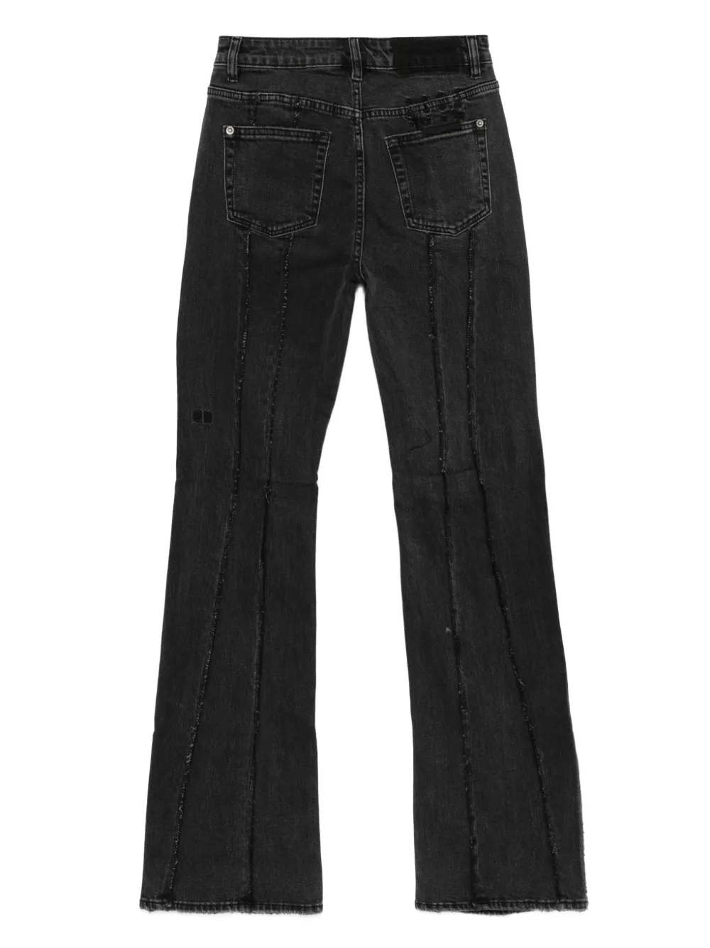 Черные рваные швы, расклешенные штанины, высокая талия, пять карманов.