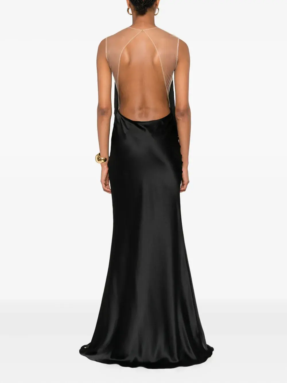 Черная бахрома, без рукавов, открытая спина, глубокий вырез.