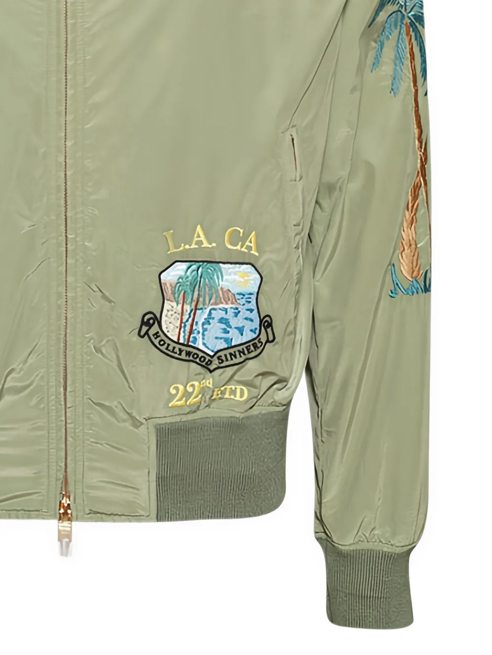 Вышитый мотив пальмы зеленого цвета, вышитая надпись, застежка-молния спереди, длинный рукав.