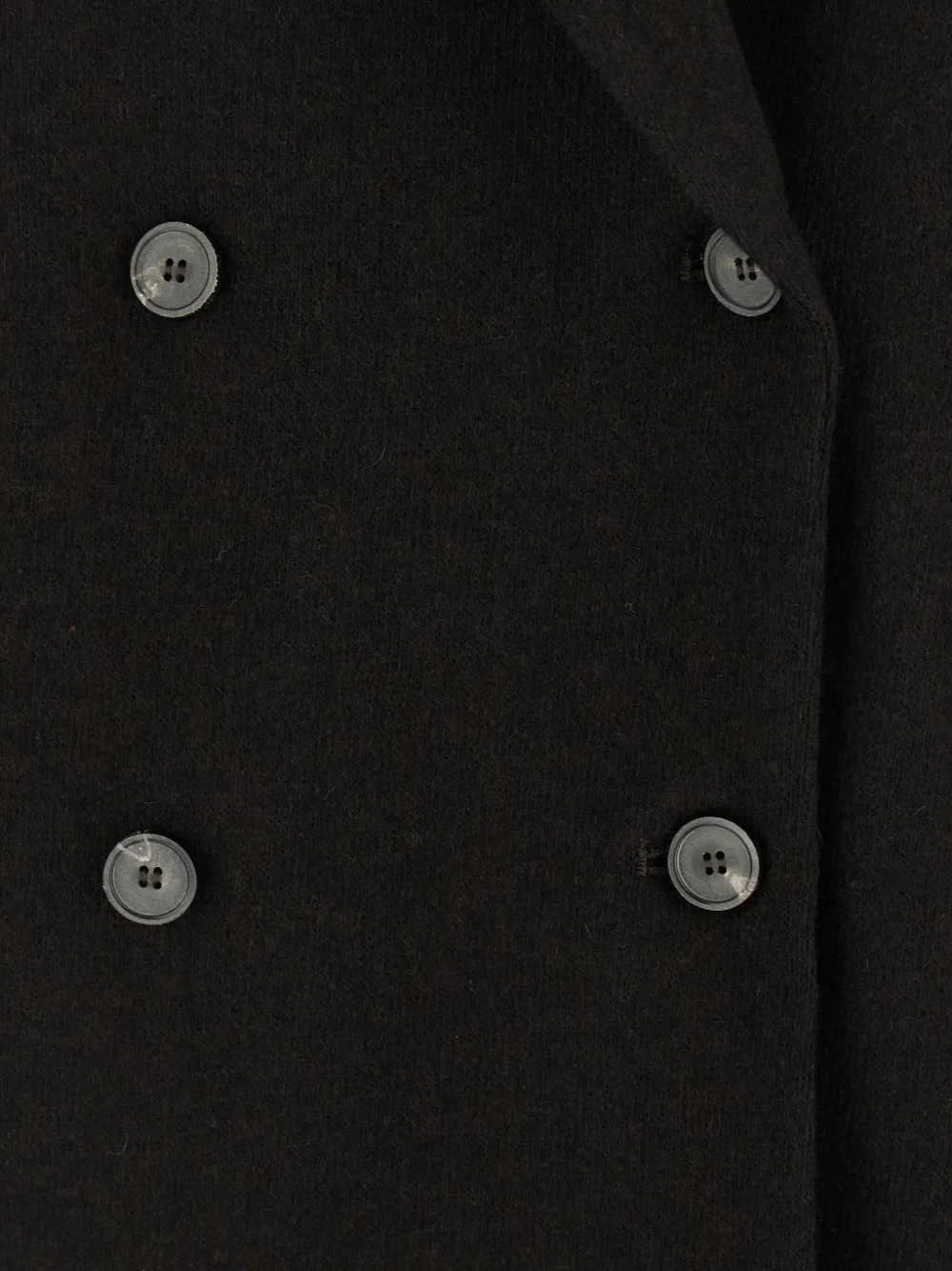 Черный двубортный пиджак с застежкой на пуговицы, заостренными лацканами, длинными рукавами, прямым подолом, карманами с клапанами, шерстью.