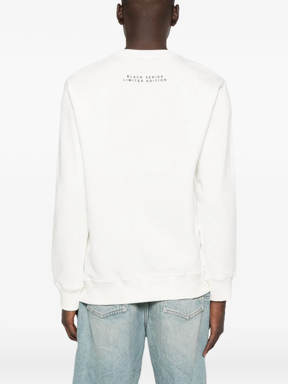 Белый хлопковый с графическим принтом, длинными рукавами и круглым вырезом.