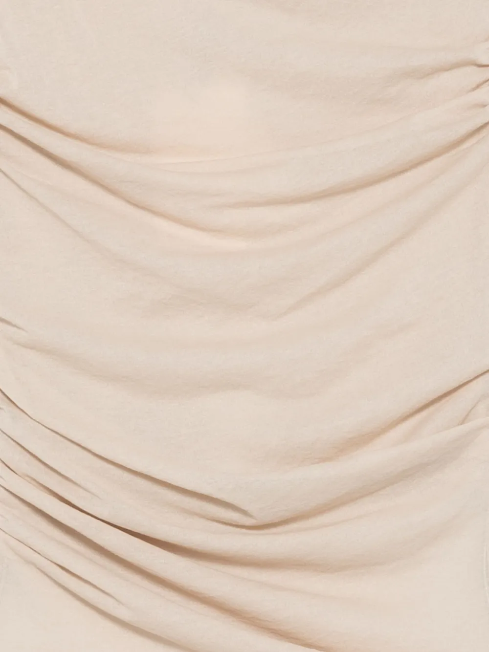 Бежевый, с присборенными деталями, длинными рукавами, облегающим асимметричным подолом.