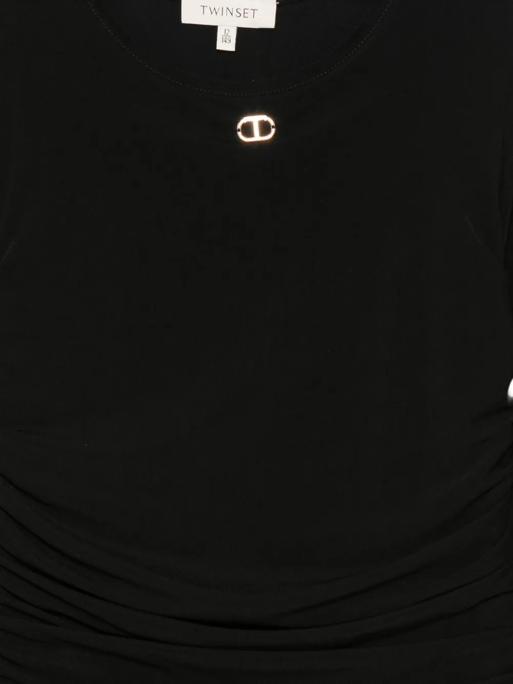 Черный присборенный лиф, длинные рукава, сетчатые рукава, круглый вырез, логотип.