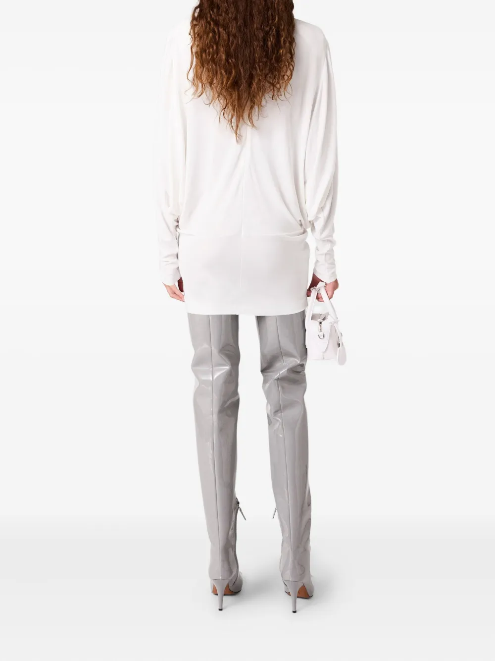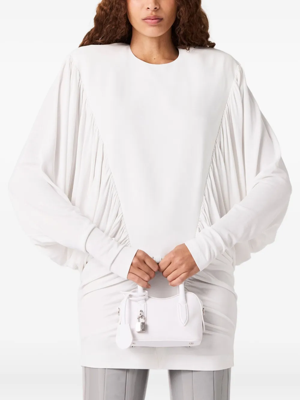 Белый присборенный дизайн с круглым вырезом и длинными рукавами