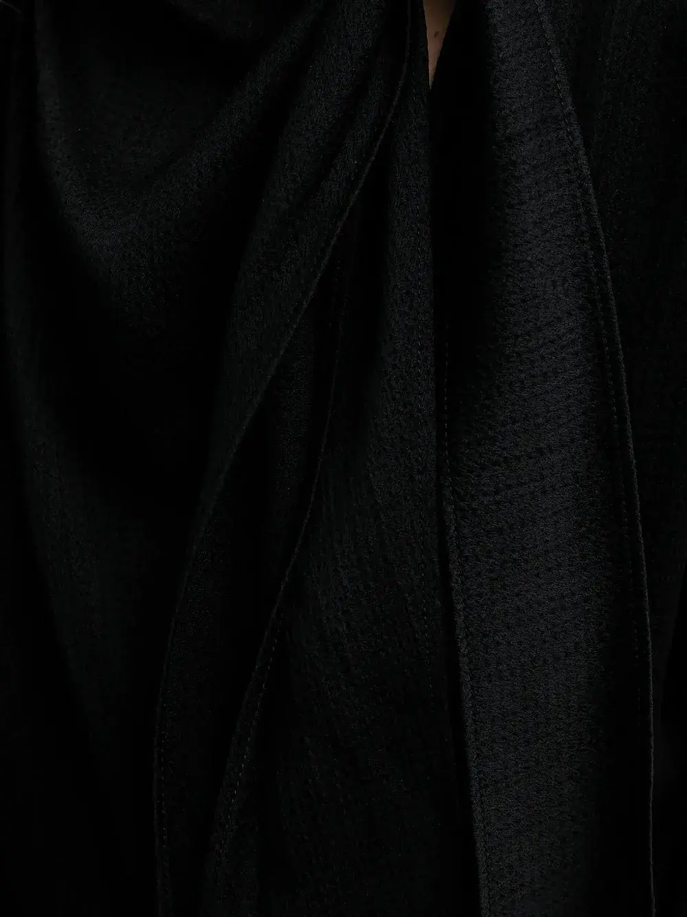 Черная юбка со сборками, короткие рукава, высокий ворот, прямой подол.