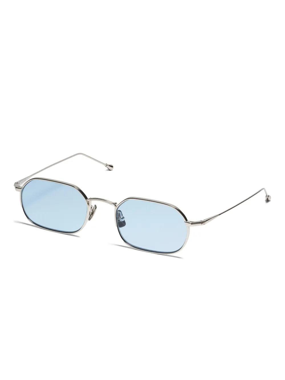 Светло-голубая геометрическая оправа, металлическая оправа, тонированные линзы, тонкие дужки. Очки поставляются с защитным футляром.