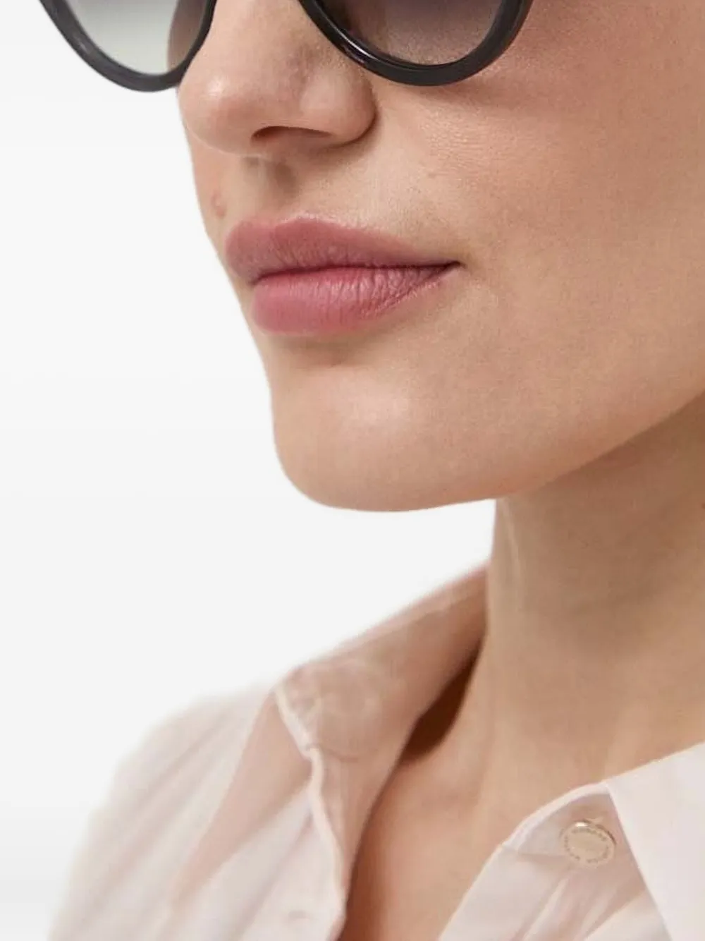 Черная геометрическая оправа с градиентными линзами, золотистый логотип, конструкция заушников из ацетата. Очки поставляются с защитным футляром.