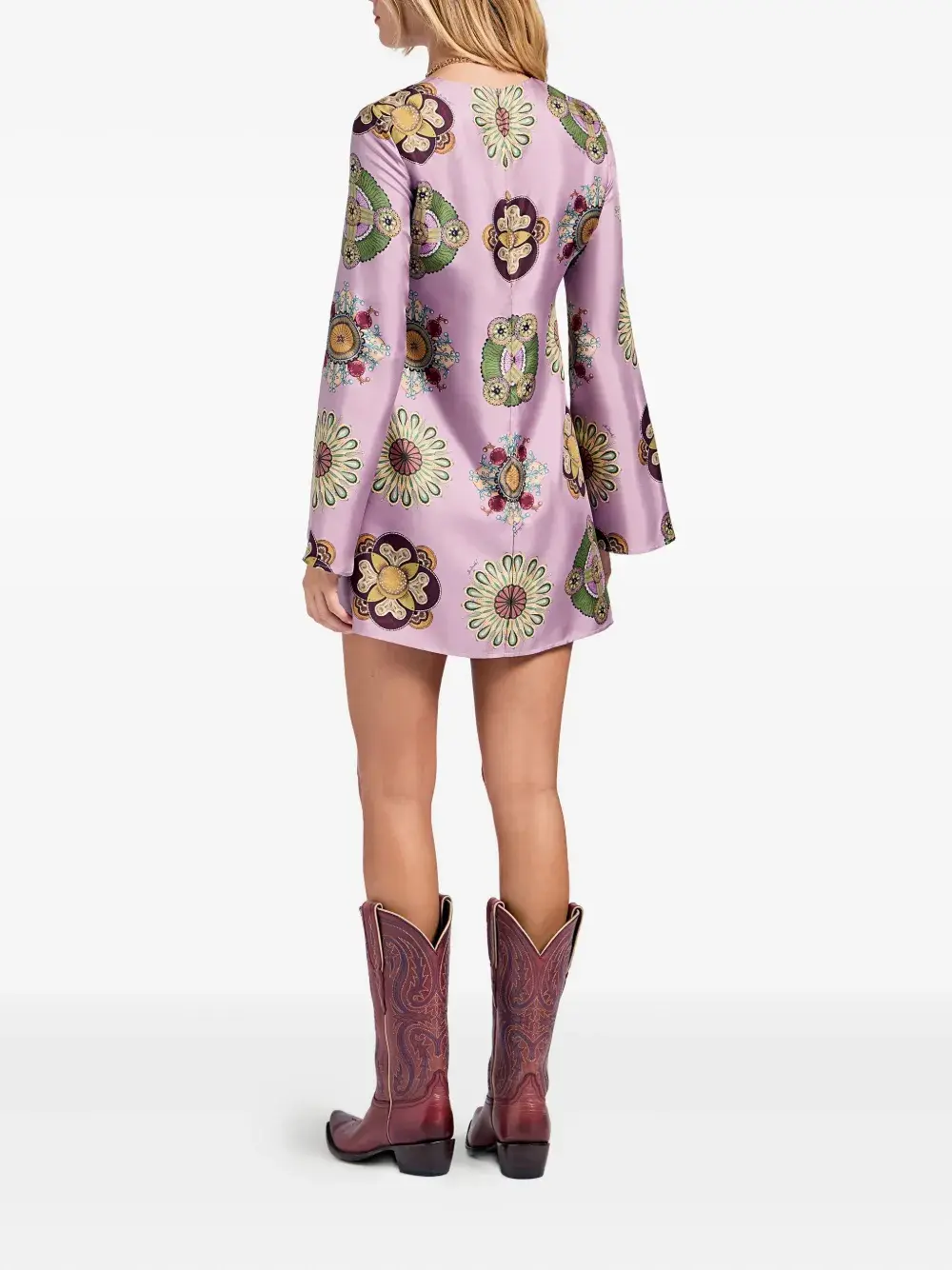 Розовый шелк с геометрическим принтом, длинными рукавами, круглым вырезом, застежкой-молнией, длиной мини.