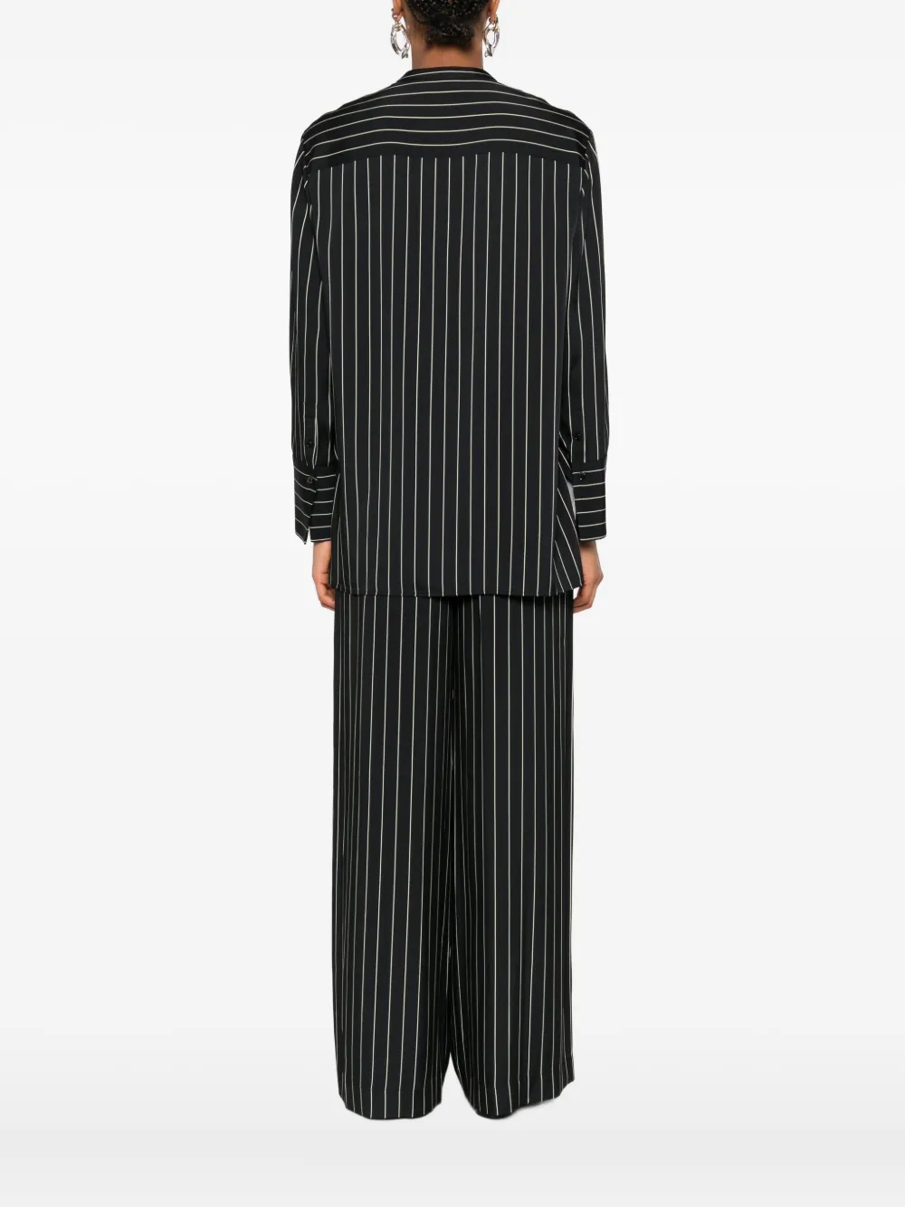 Черный узор в тонкую полоску, геометрический узор, воротник-стойка, длинные рукава, разрезы по бокам.