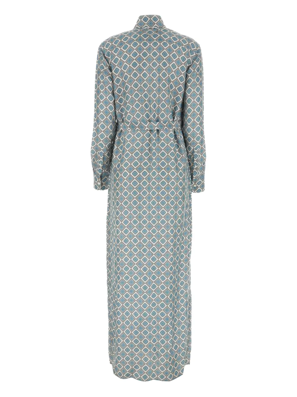 Синий шелковый воротник рубашки с геометрическим принтом, застегивающийся на пуговицы и завязывающийся пояс.