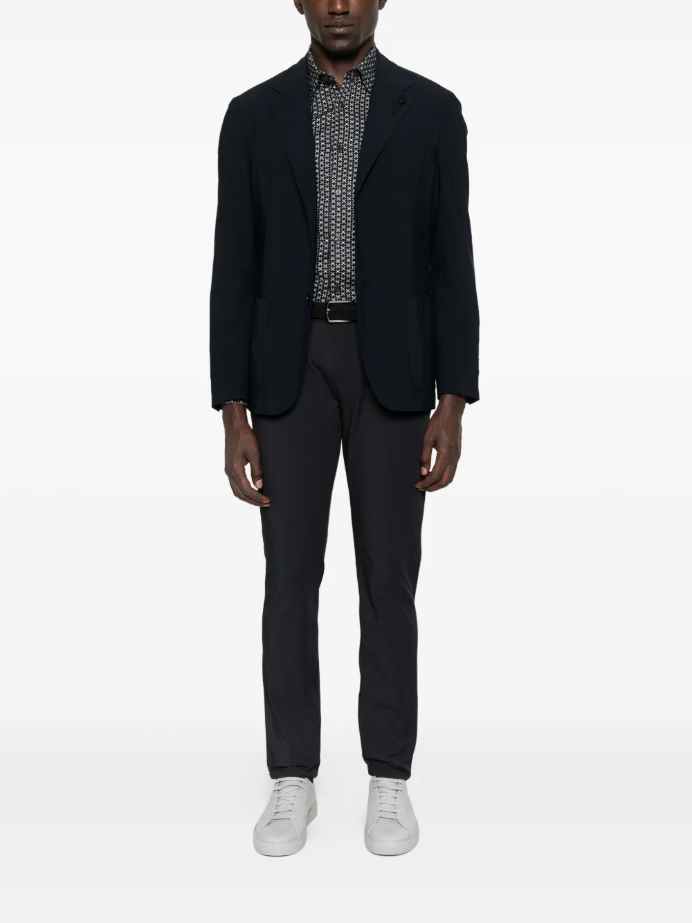 Темно-синий геометрический принт, длинные рукава, застежка на пуговицы, воротник-стойка, хлопковый материал