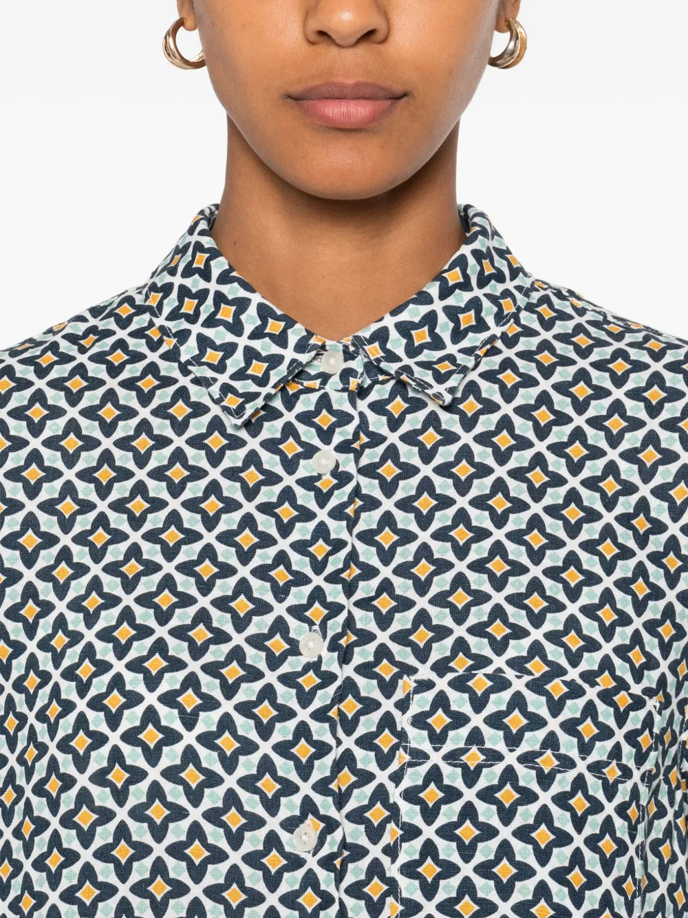 Синий геометрический узор, застежка на пуговицы, воротник-стойка