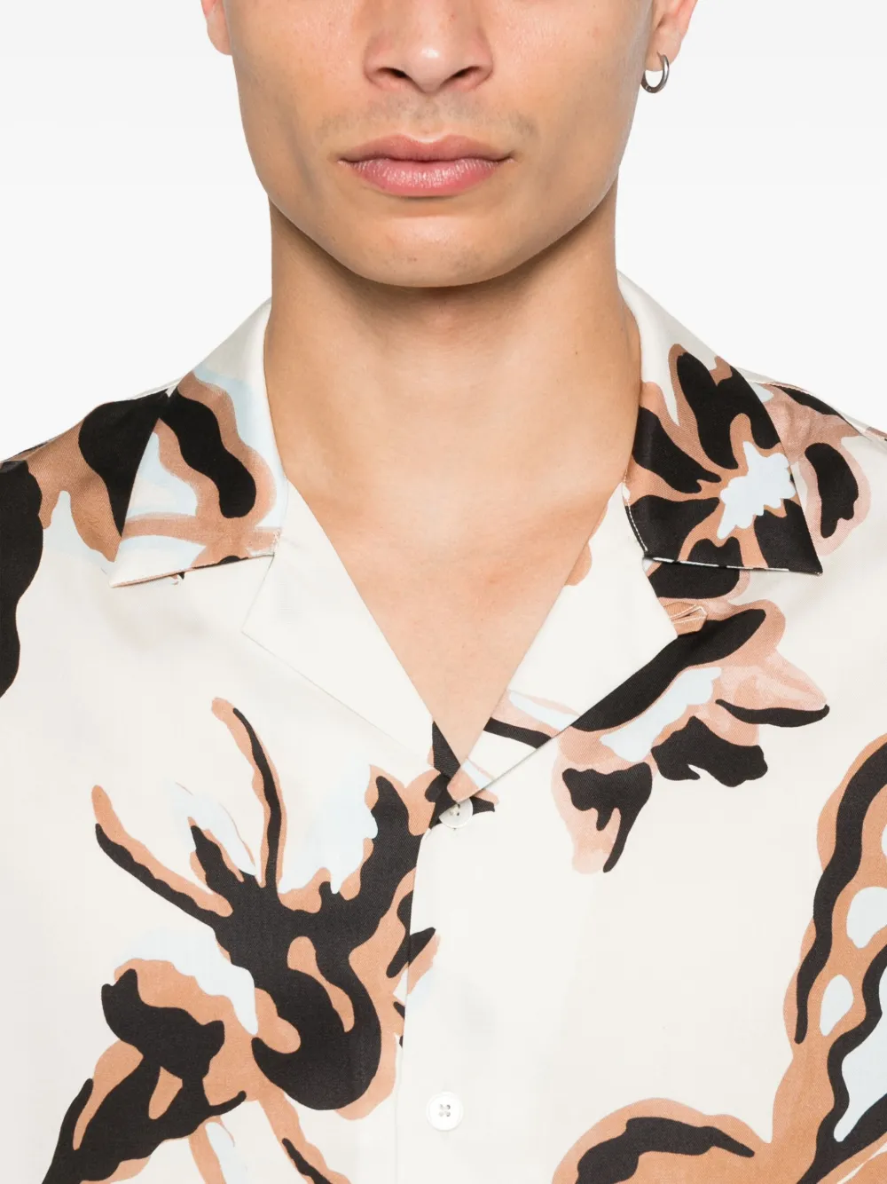 Белый геометрический принт, короткие рукава, застежка на пуговицы.