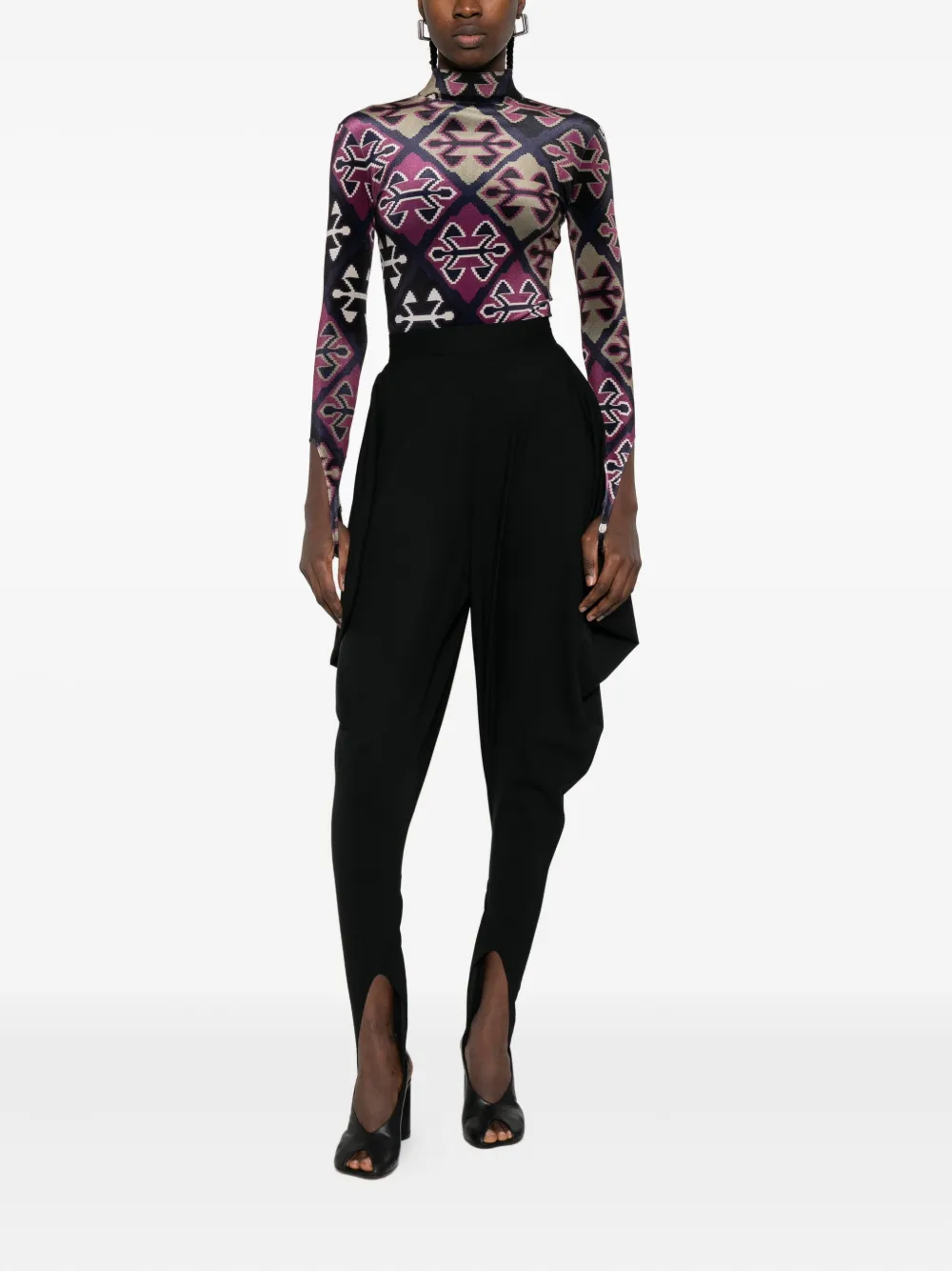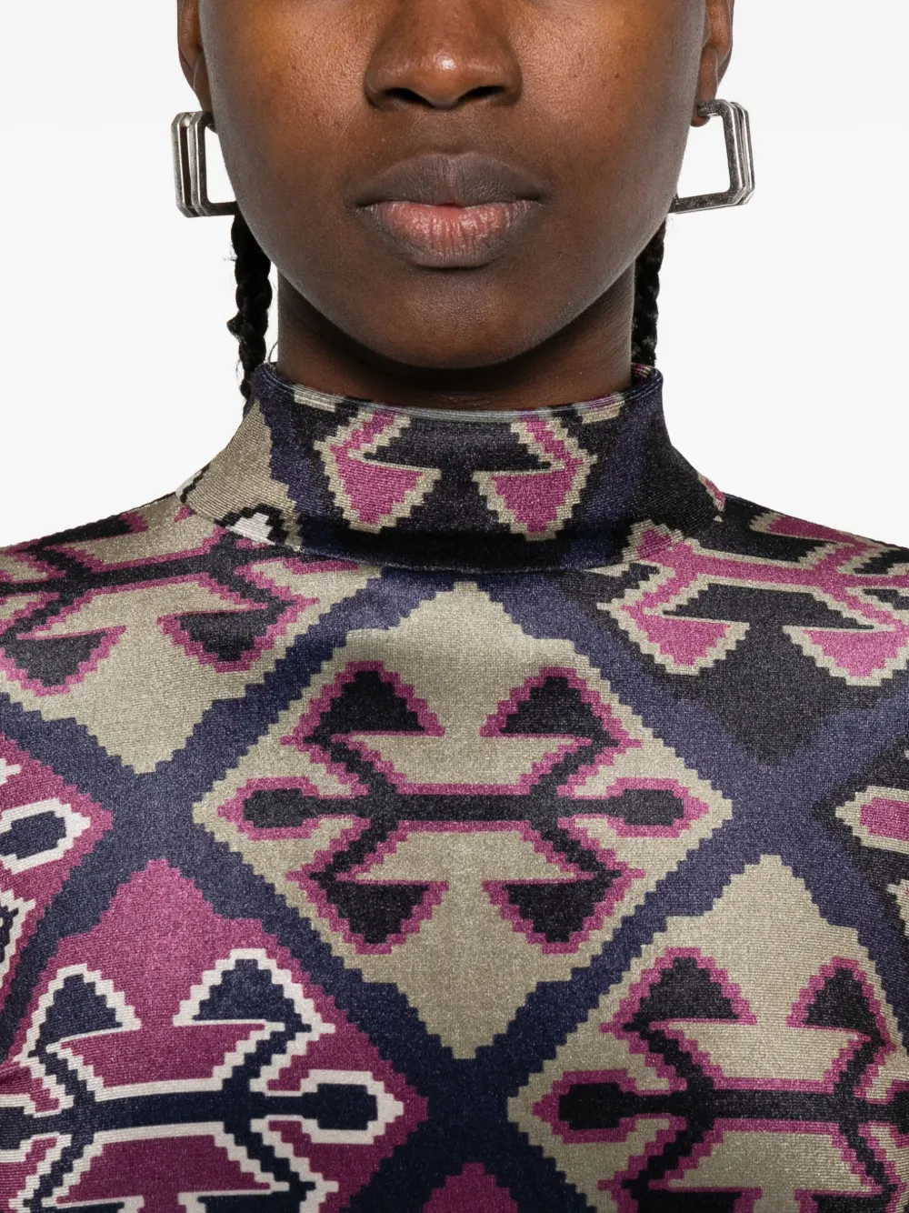 Темно-синий бархат, текстура, геометрический принт, высокий ворот, длинные рукава, разрезы на манжетах. Напоминаем, что эту вещь следует примерять поверх собственной одежды.