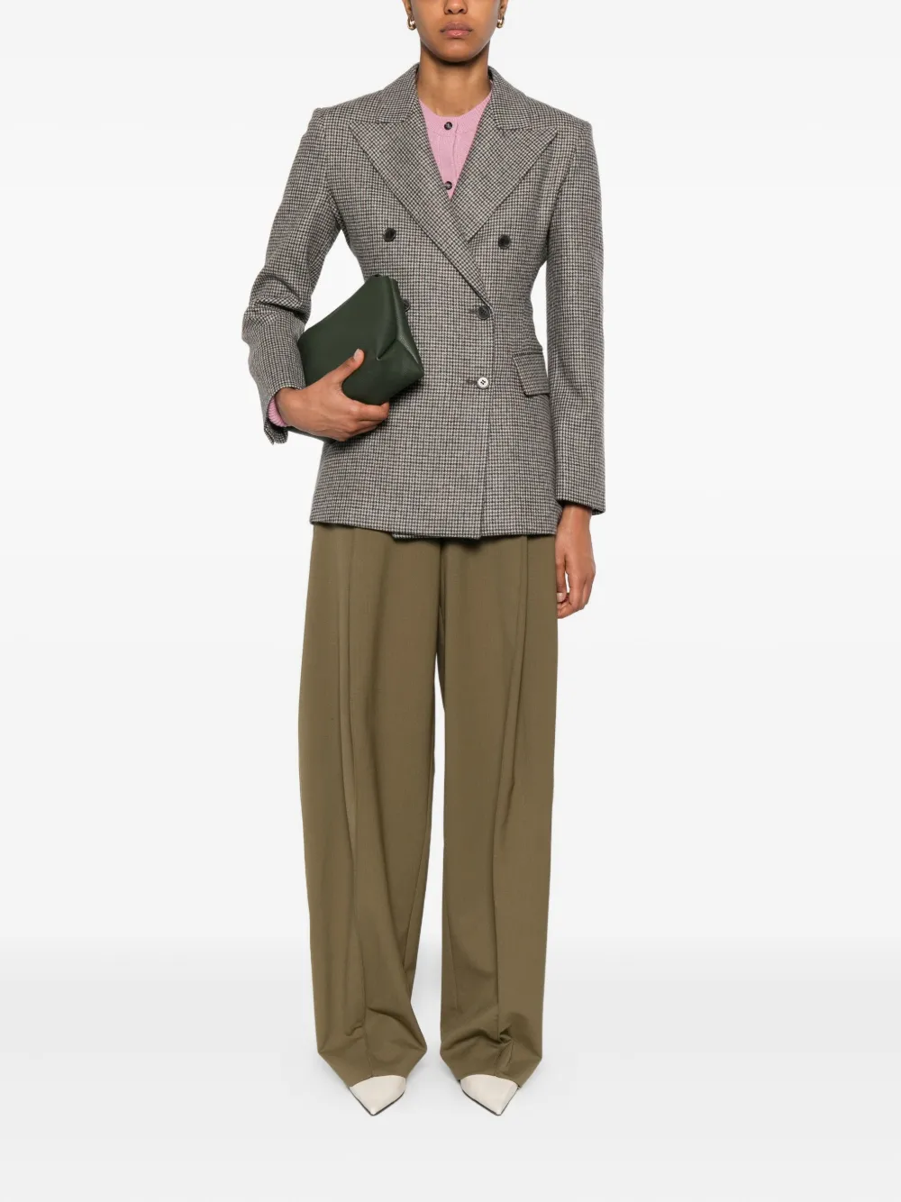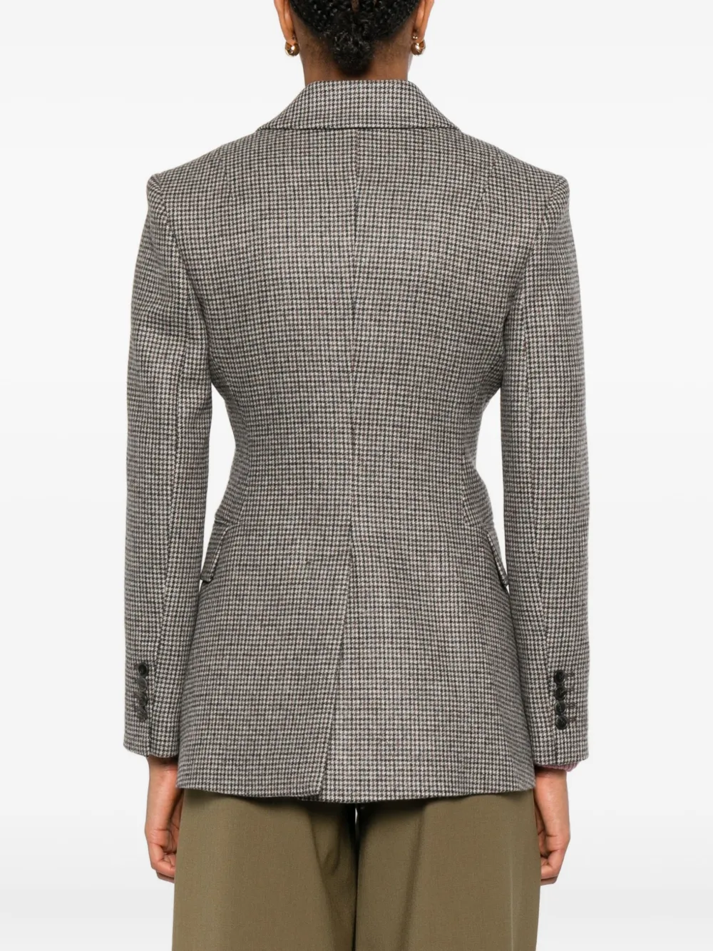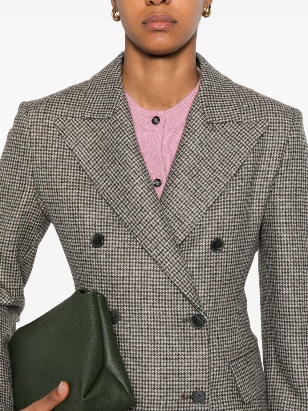 Коричневый двубортный пиджак с заостренными лацканами, длинными рукавами и карманами с клапанами.