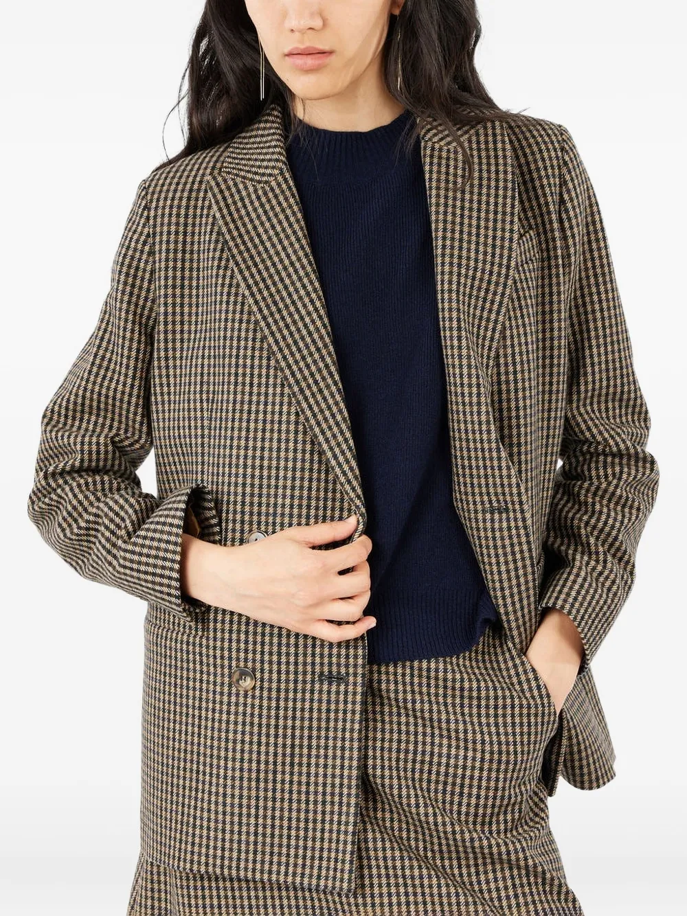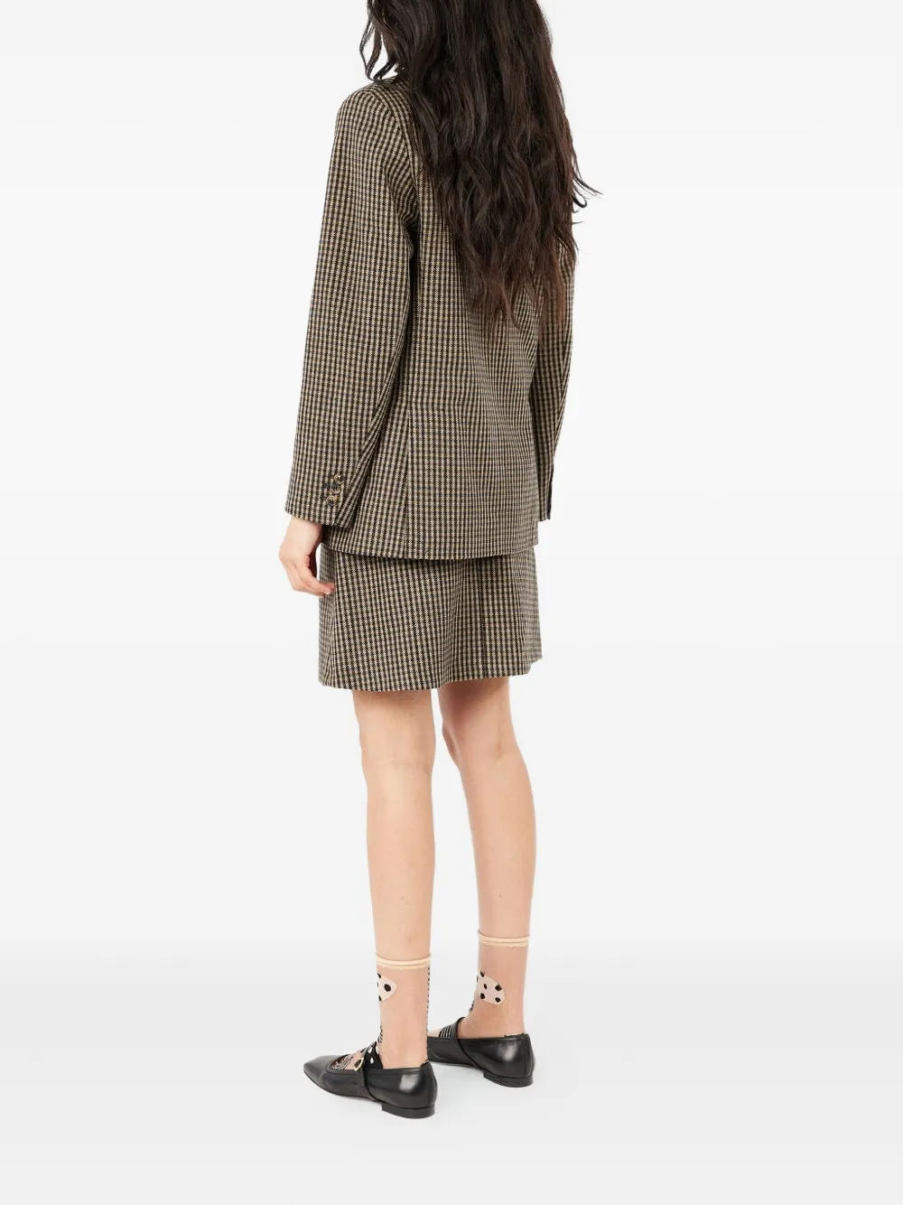 Коричневый клетчатый узор в клетку, двубортная застежка, заостренные лацканы, прорезные карманы, длинные рукава.
