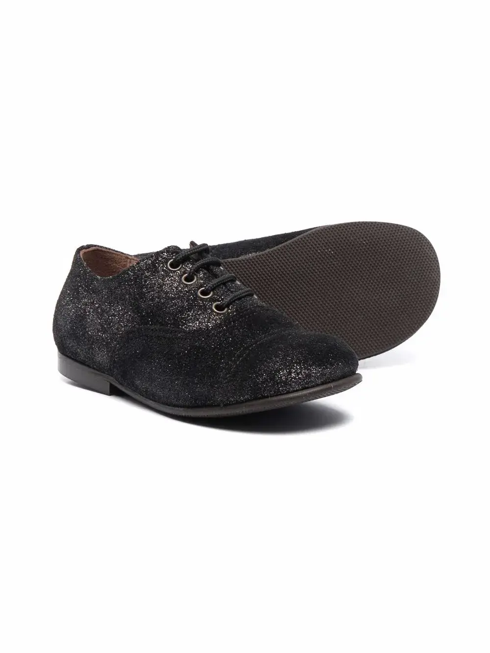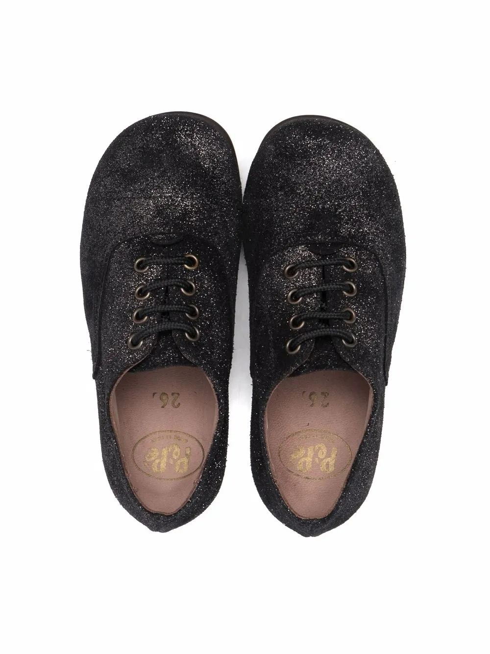 Блестящий материал, шнуровка спереди, закругленный носок и плоская резиновая подошва.