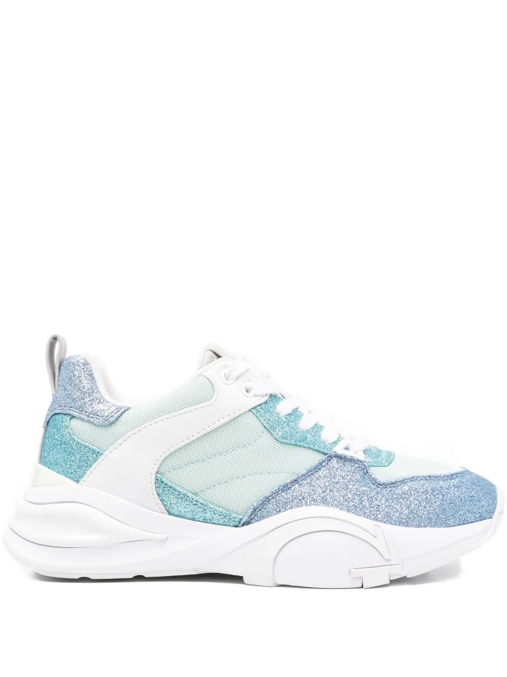 Светло-голубые блестящие вставки из сетки, шнуровка, массивная резиновая подошва, мягкий воротник-стойка