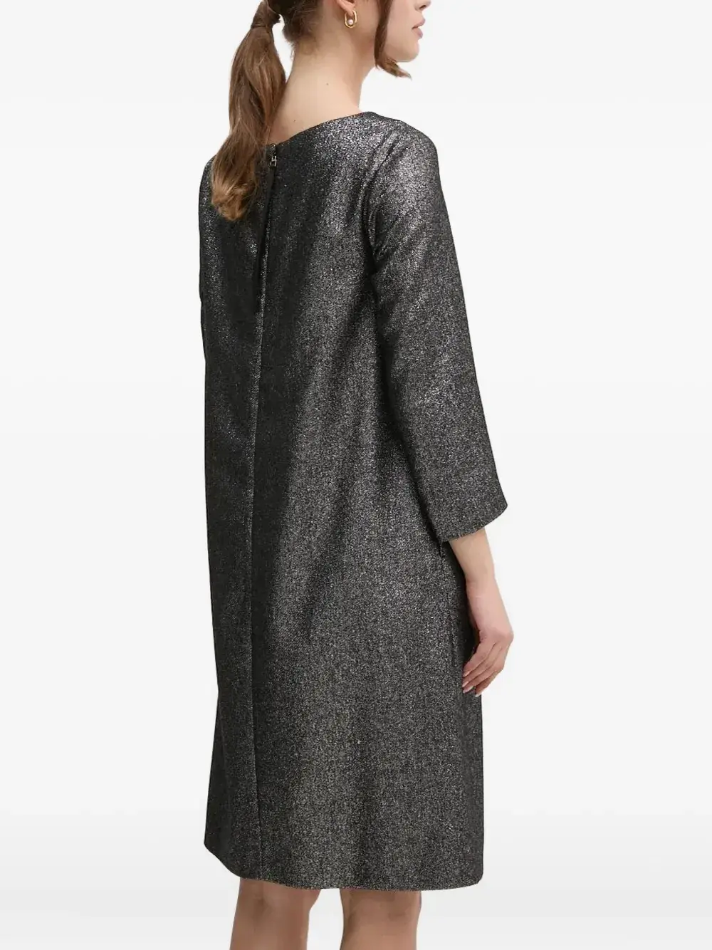 Черный металлический блеск, вырез «лодочка», рукава три четверти, потайная застежка-молния, А-образный силуэт.