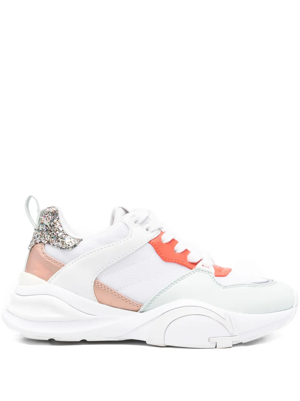Белые блестящие вставки, оранжевые акценты, шнуровка, массивная резиновая подошва, низкий верх