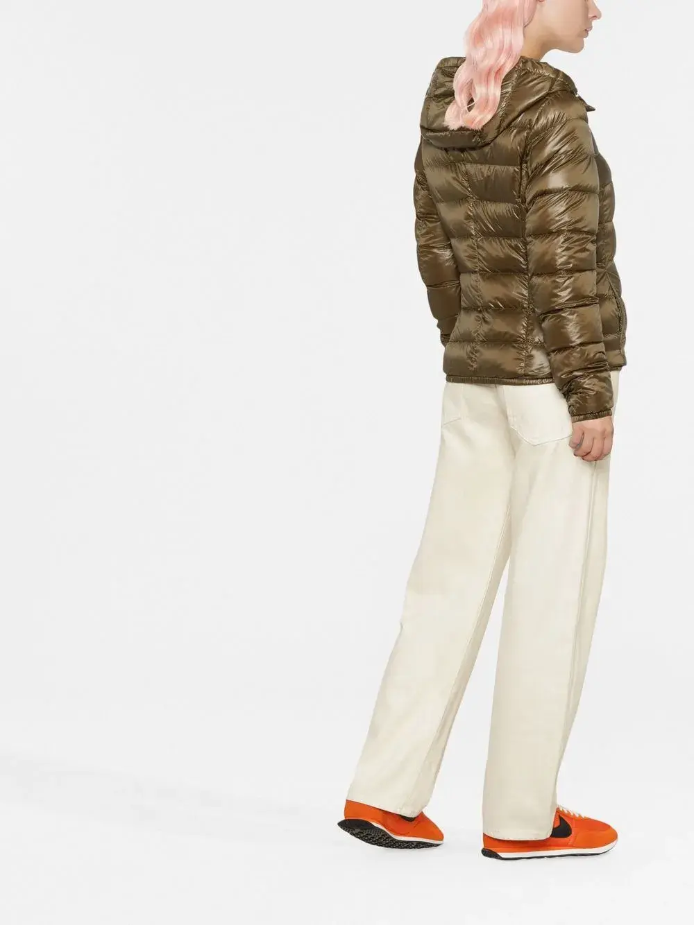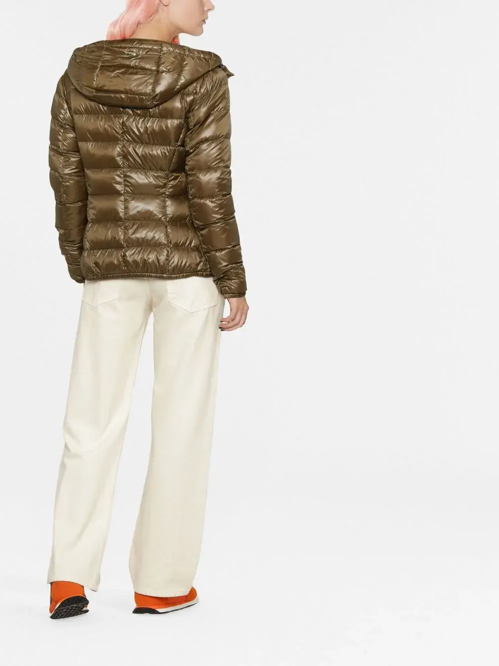 Хаки, наполнитель из пуха и перьев, дутый материал, лакированное покрытие, стеганая модель, воротник-стойка, классический капюшон, застежка на молнии спереди, длинные рукава, два кармана на молнии по бокам и прямой подол.