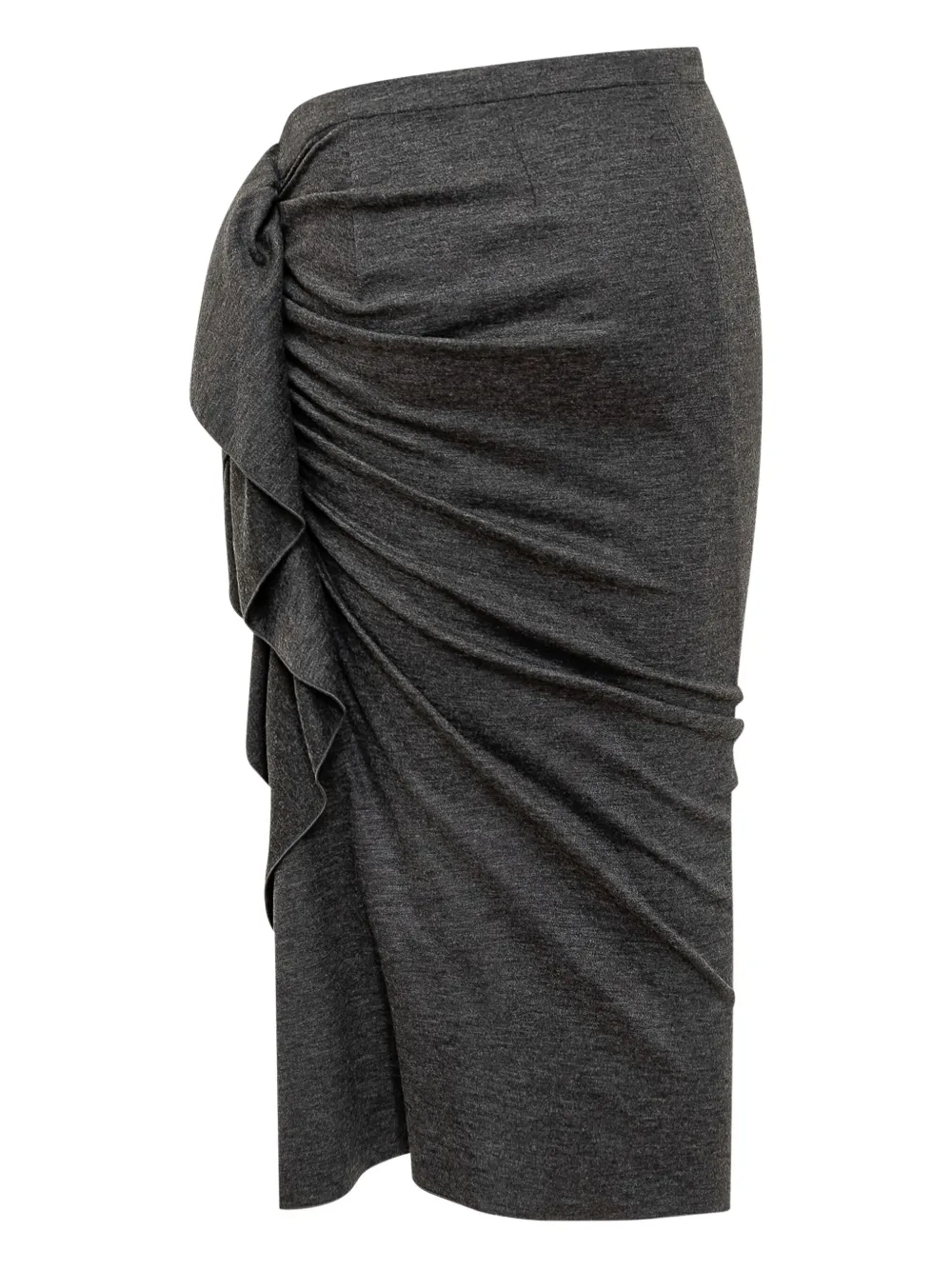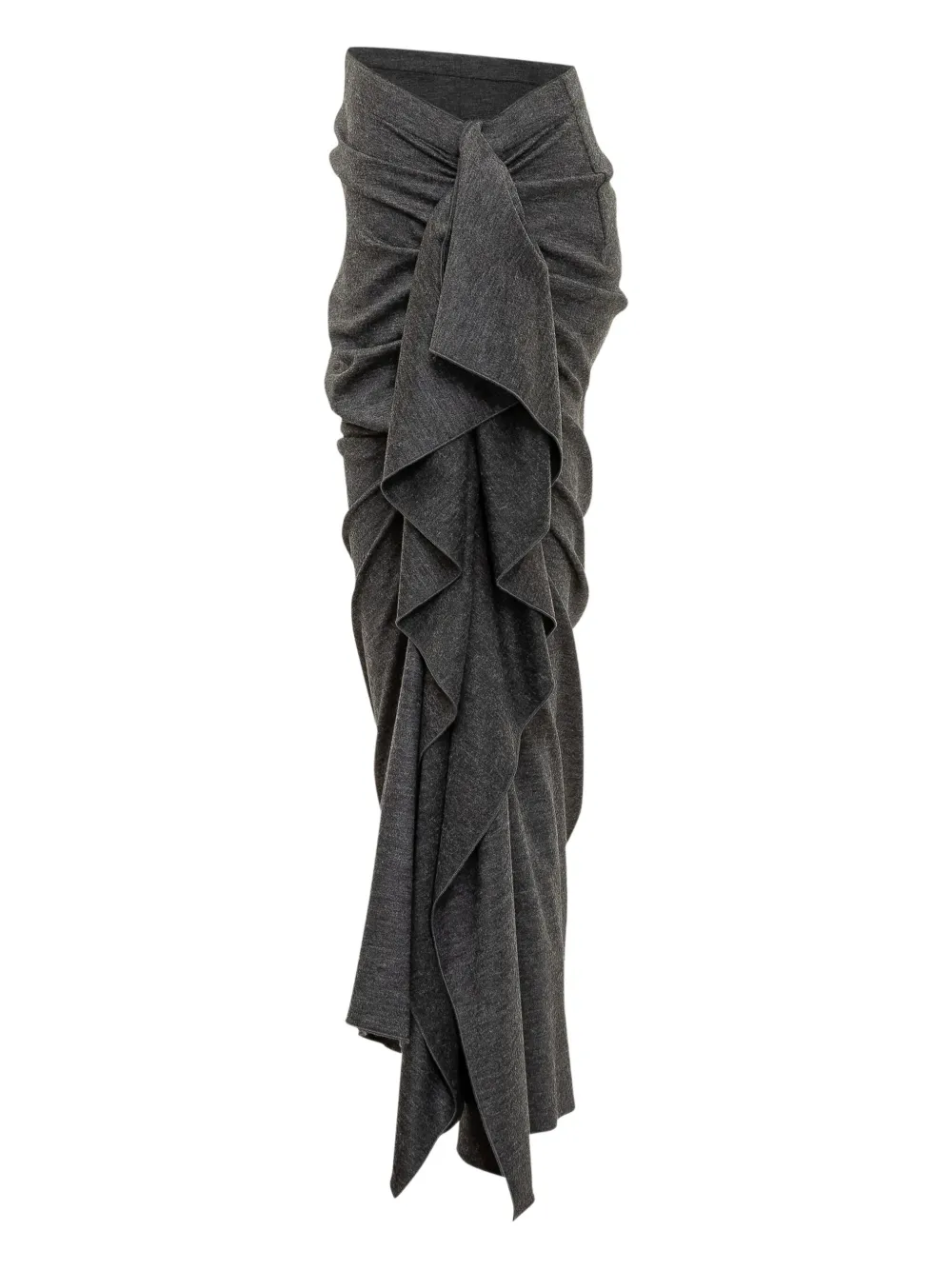 Серая драпированная ткань, асимметричный подол, оборки, высокая талия.