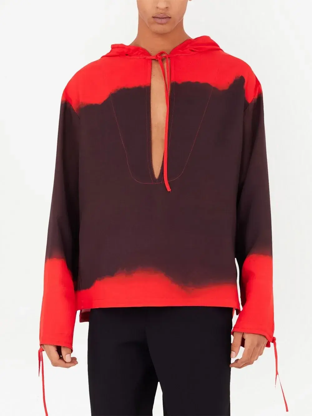 Ярко-красный, красно-коричневый, градиентный эффект, затягивающийся на шнурок капюшон, длинные рукава и прямой подол.