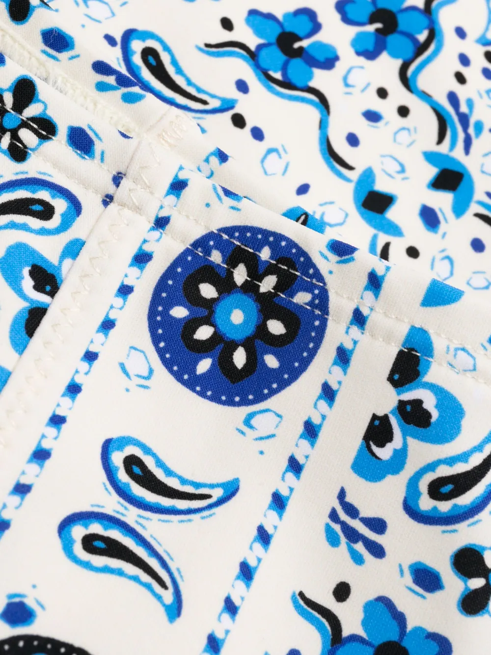 Белый, синий, эластичный материал, сплошной графичный принт, завышенная талия и модель без застежки. Пожалуйста, примеряйте купальники и пляжные шорты только поверх собственного белья.