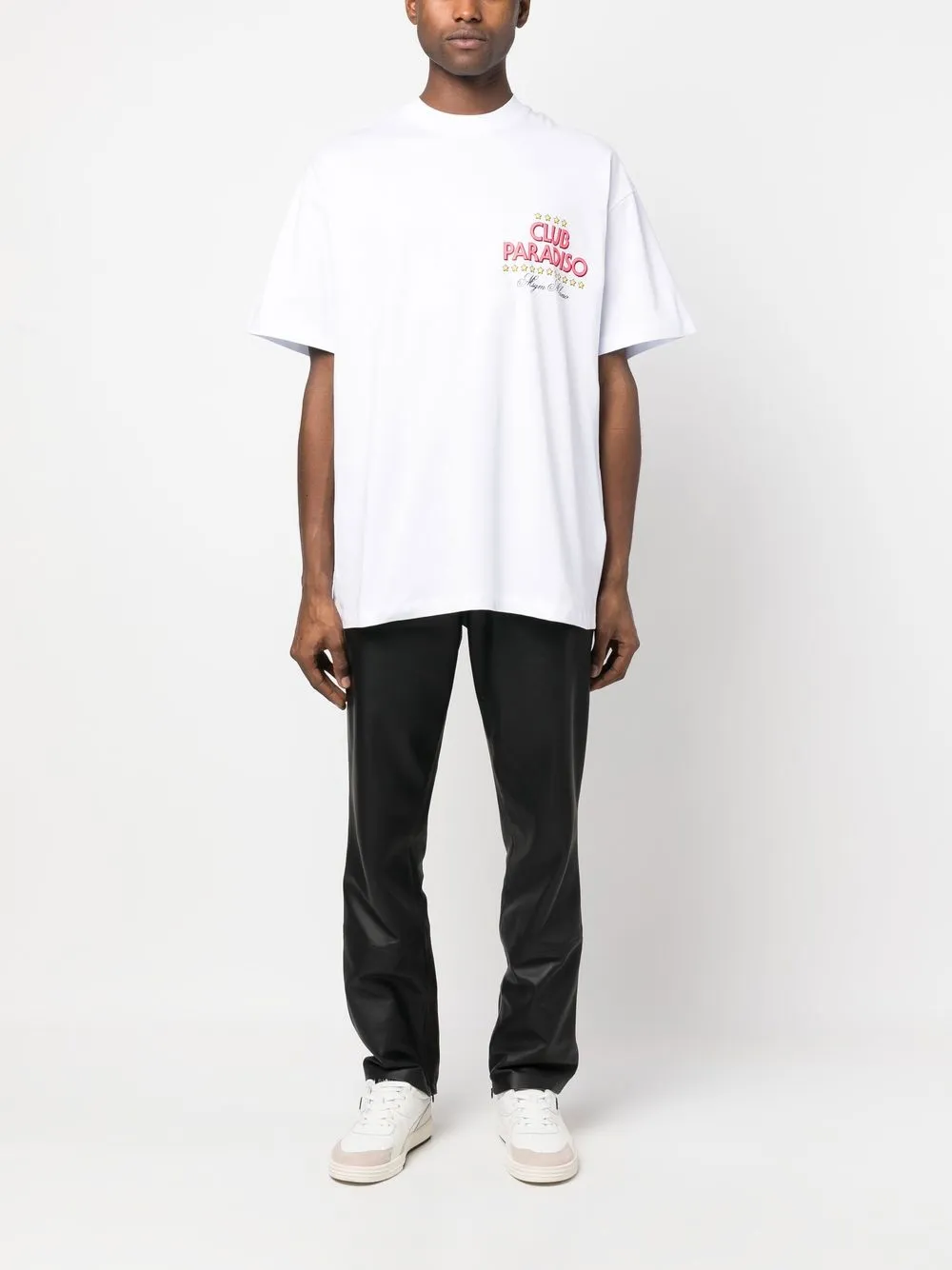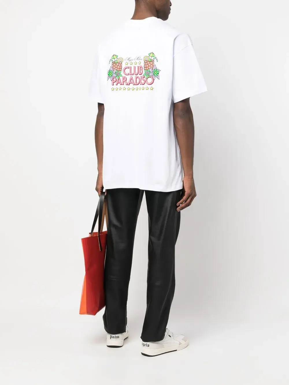 Белый, хлопок, ткань джерси, принт на груди, графичный принт на спине, круглый вырез, приспущенные плечи, короткие рукава и прямой подол.