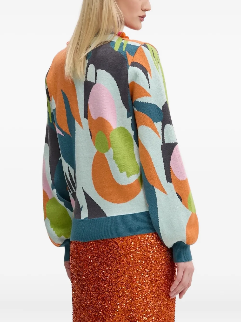 Многоцветный графический принт, отделка помпонами, V-образный вырез, застежка на пуговицы, рукава-фонарики