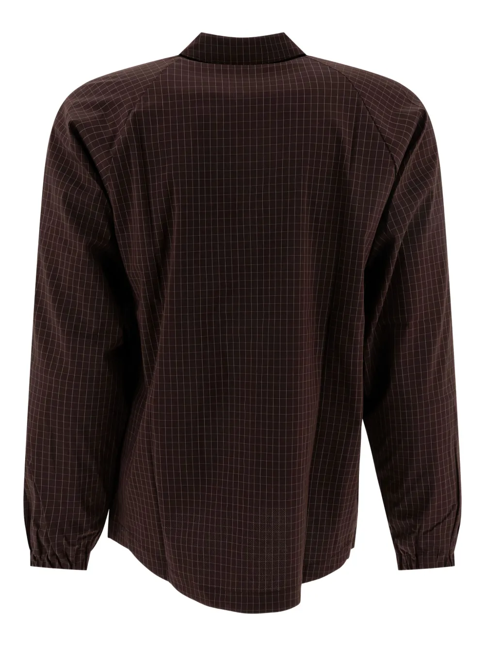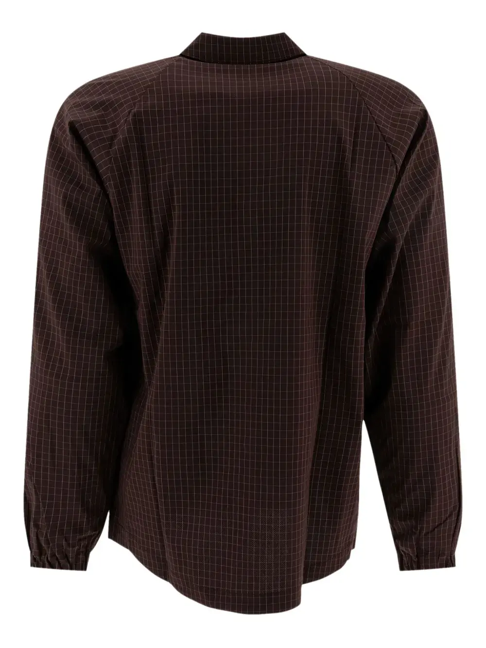 Коричневый сетчатый узор, длинные рукава, застежка на пуговицы, длинные рукава.