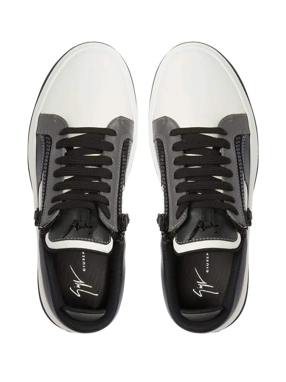 Белый/черный, кожа, стиль колор-блок, шнуровка спереди, застежка на молнии сбоку, металлический логотип на язычке, закругленный носок и плоская резиновая подошва.