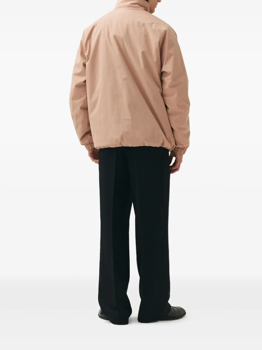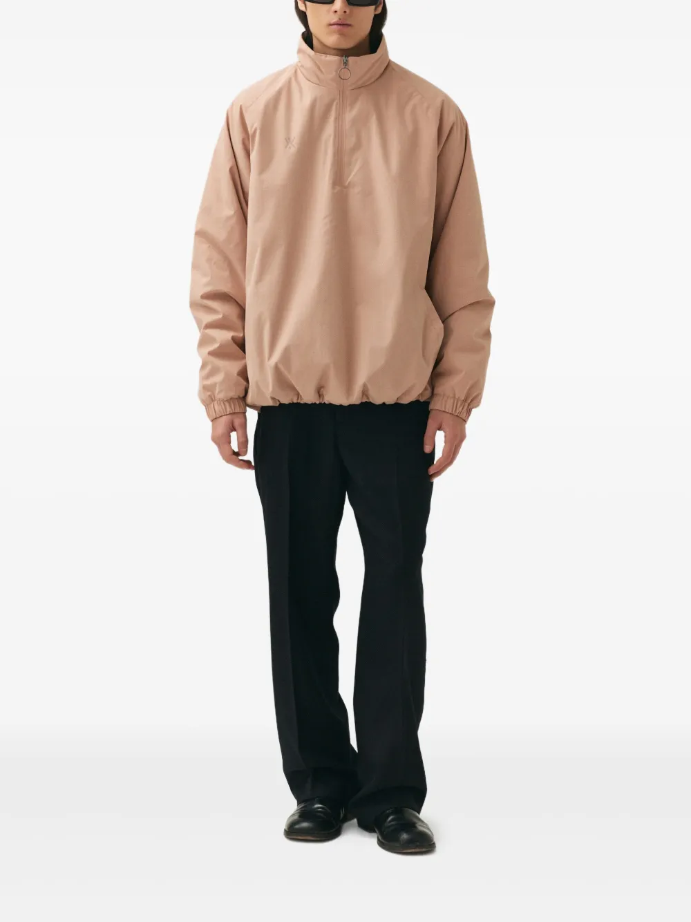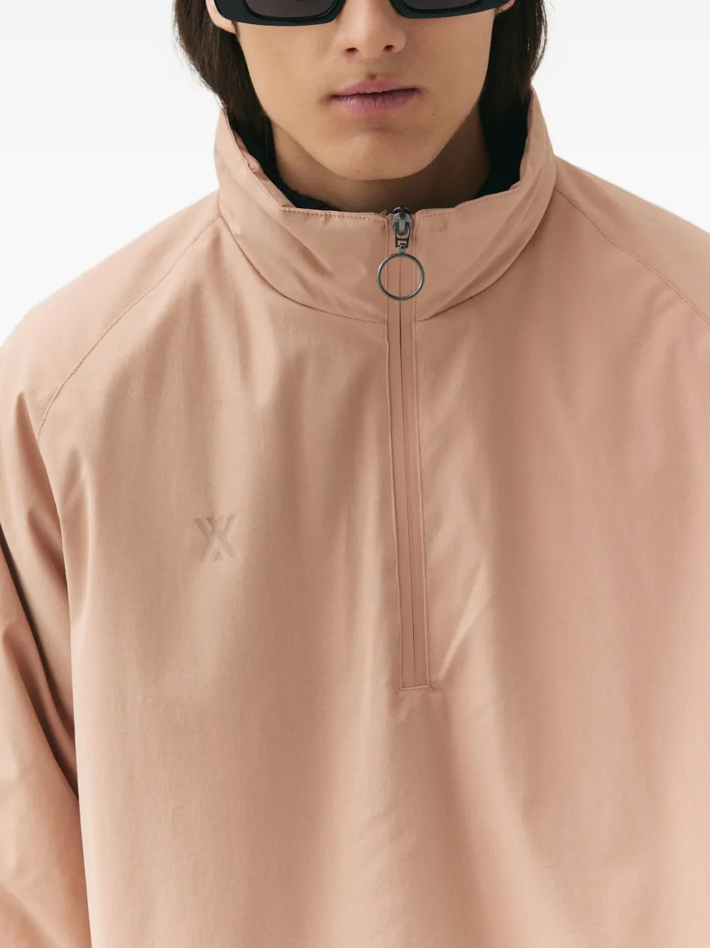 Пыльно-розовая застежка-молния на половину длины, карманы-кенгуру, высокий ворот, длинные рукава.
