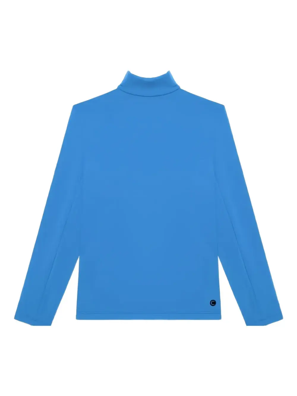 Синяя водолазка с застежкой-молнией до середины бедра и длинными рукавами, вертикальным логотипом.