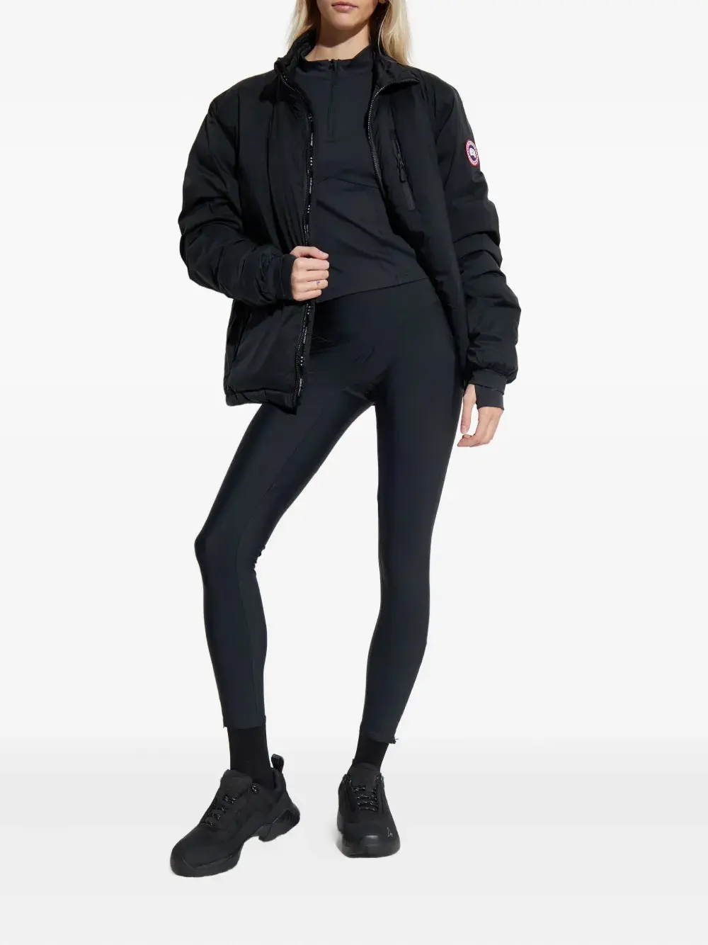 Черный с высоким воротом, застежкой-молнией до середины бедра, длинными рукавами и отверстиями для больших пальцев.