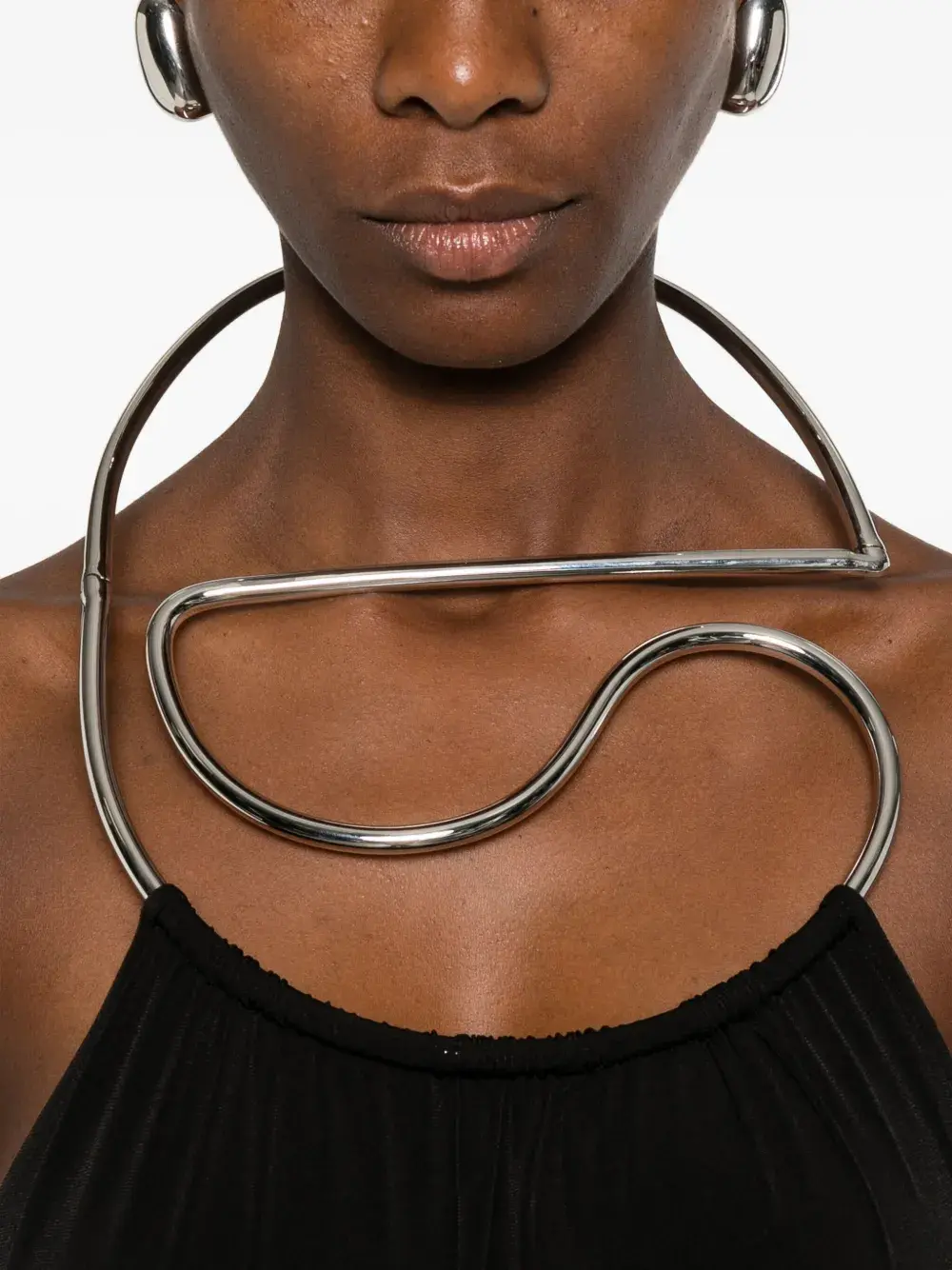 Черный топ с открытой спиной, халтер-воротником, серебристая фурнитура, встроенный металлический воротник.